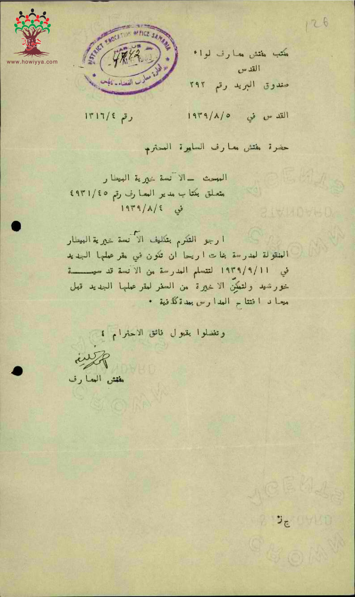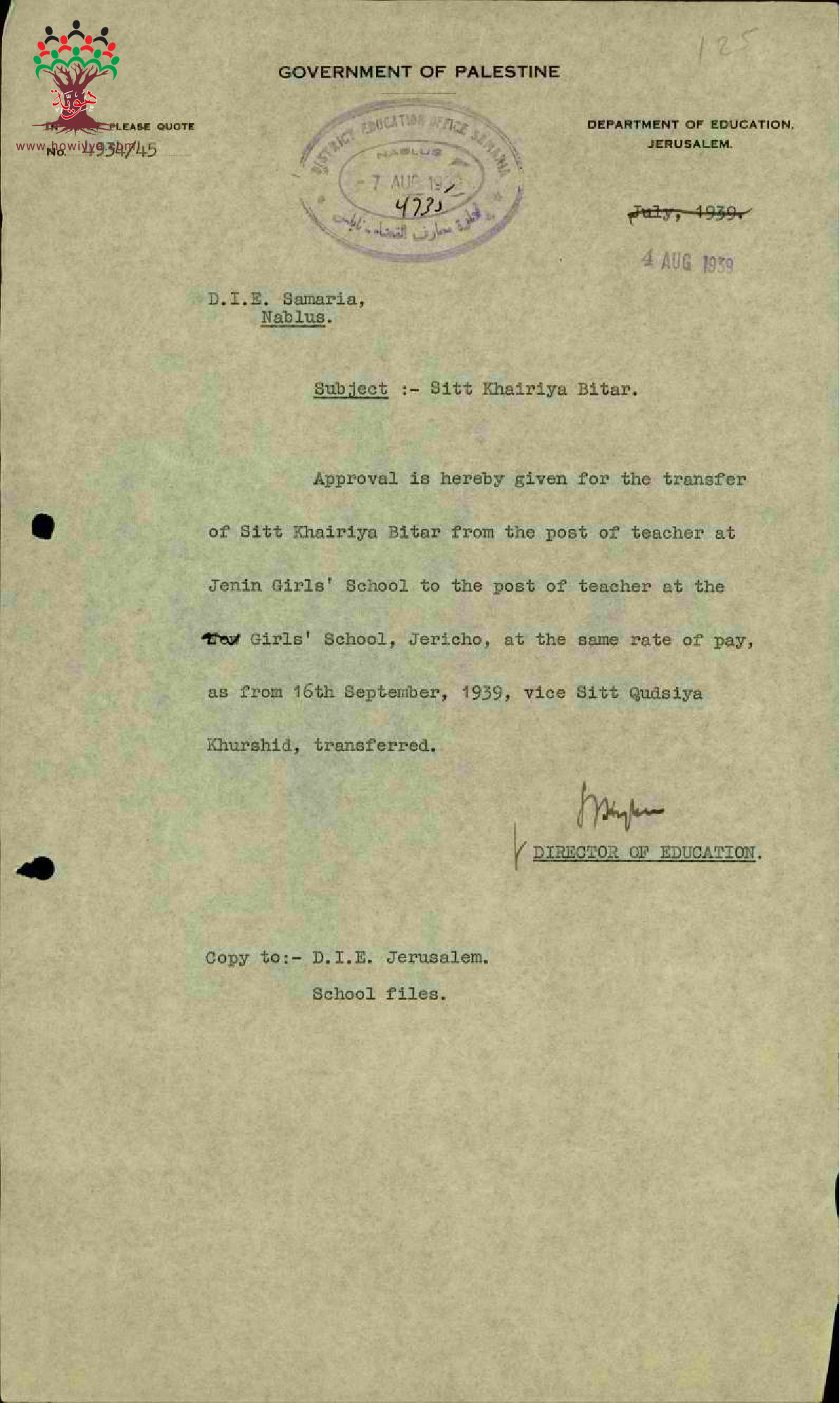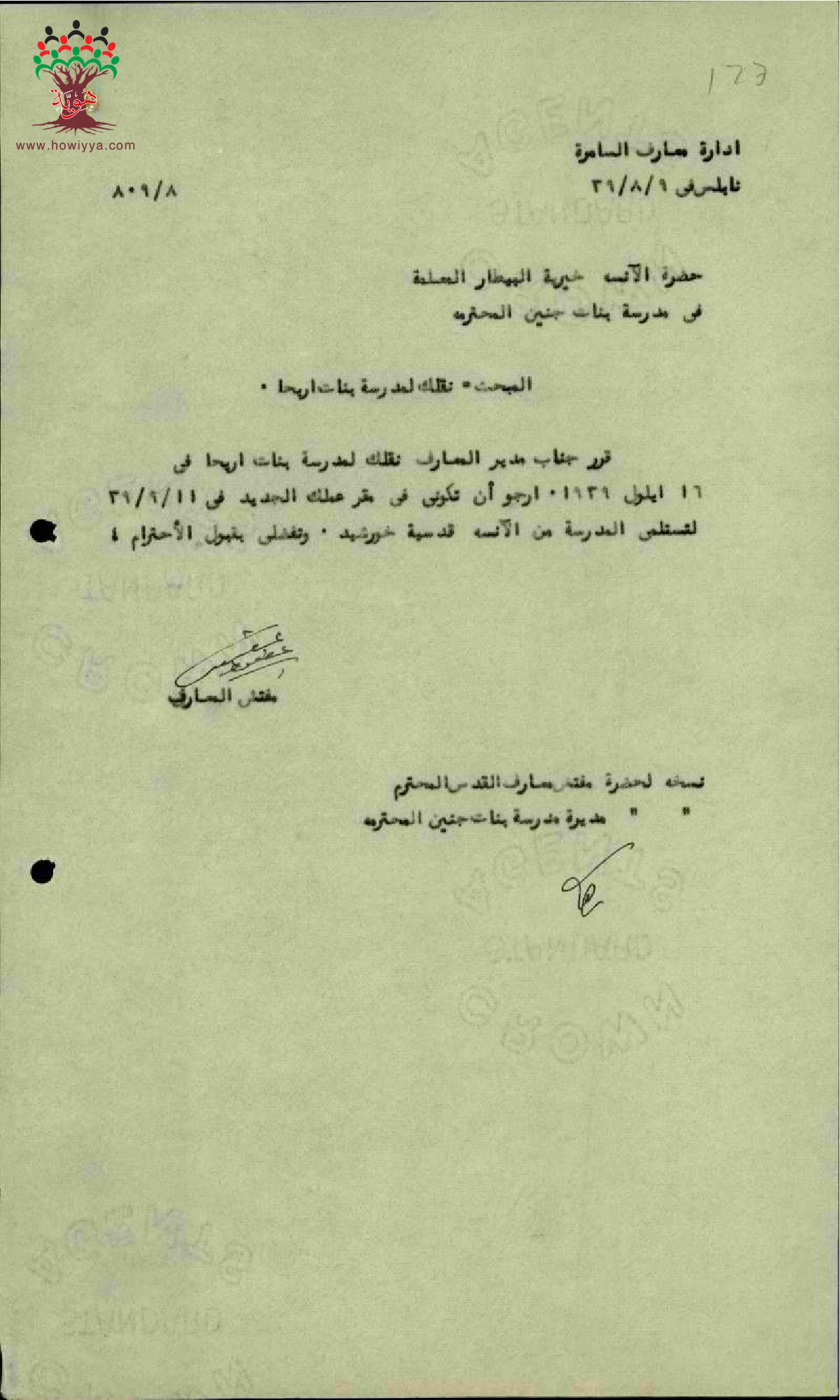 مجموعة رسائل بخصوص نقل المعلم خيرية بيطار من مدرسة جنين الى مدرسة أريحا