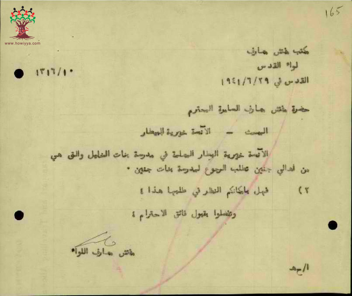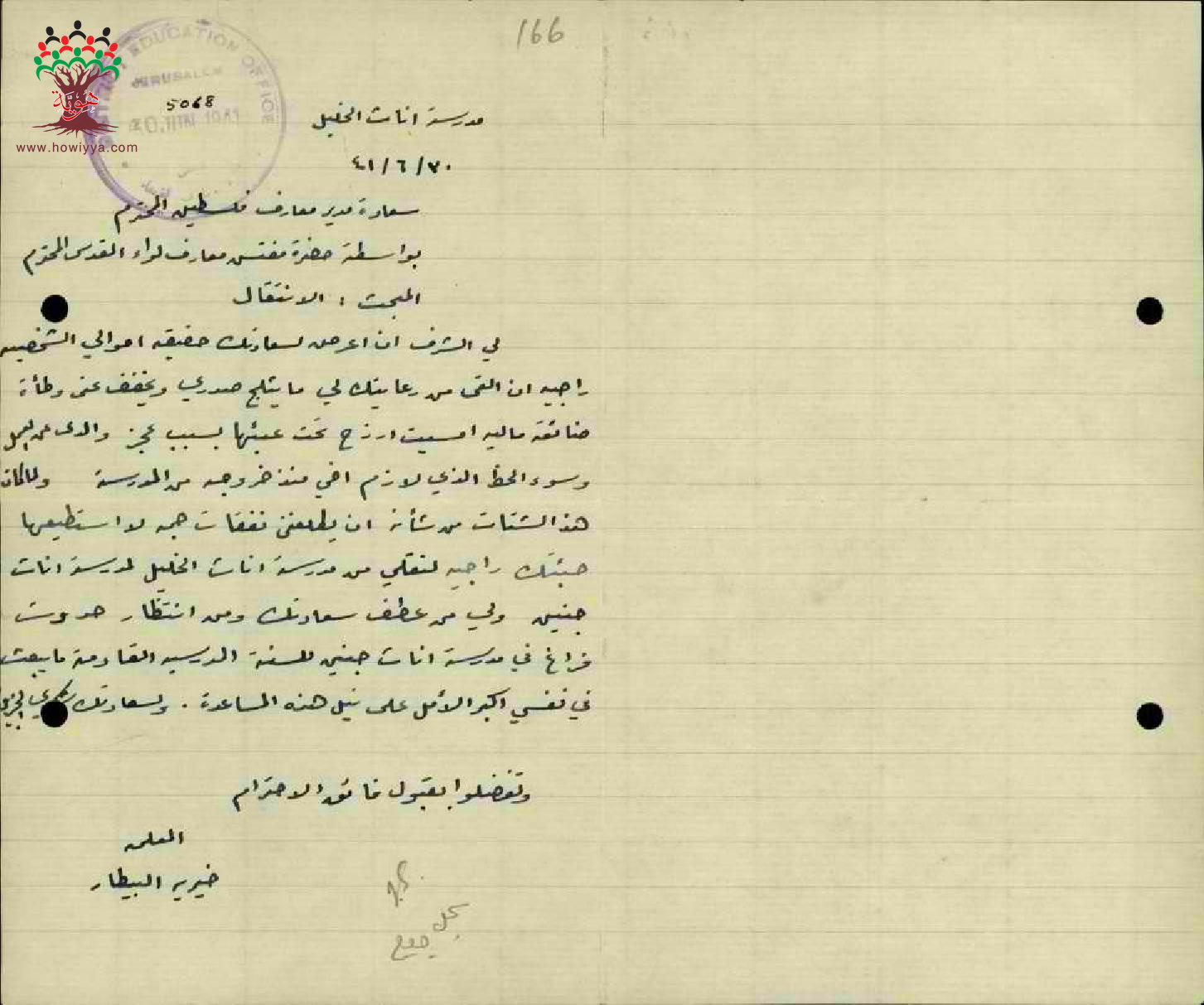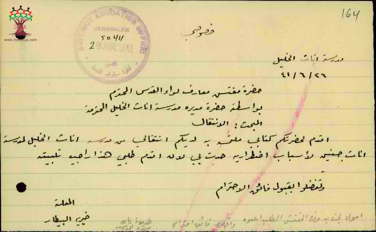 مجموعة رسائل بخصوص امكانية نقل المعلمة خيرية بيطار من مدرسة بنات الخليل الى مدرسة جنين