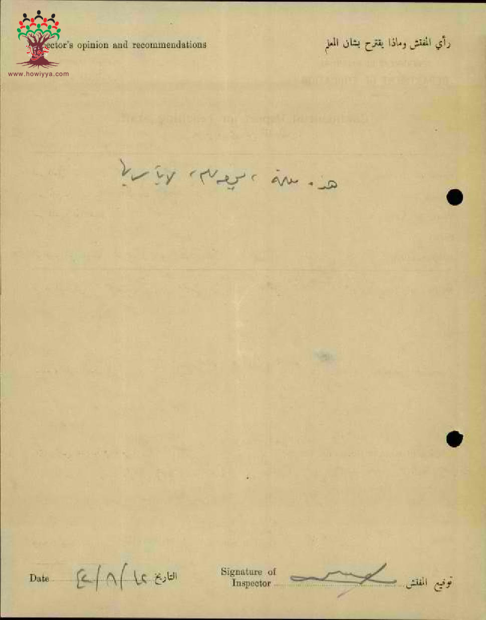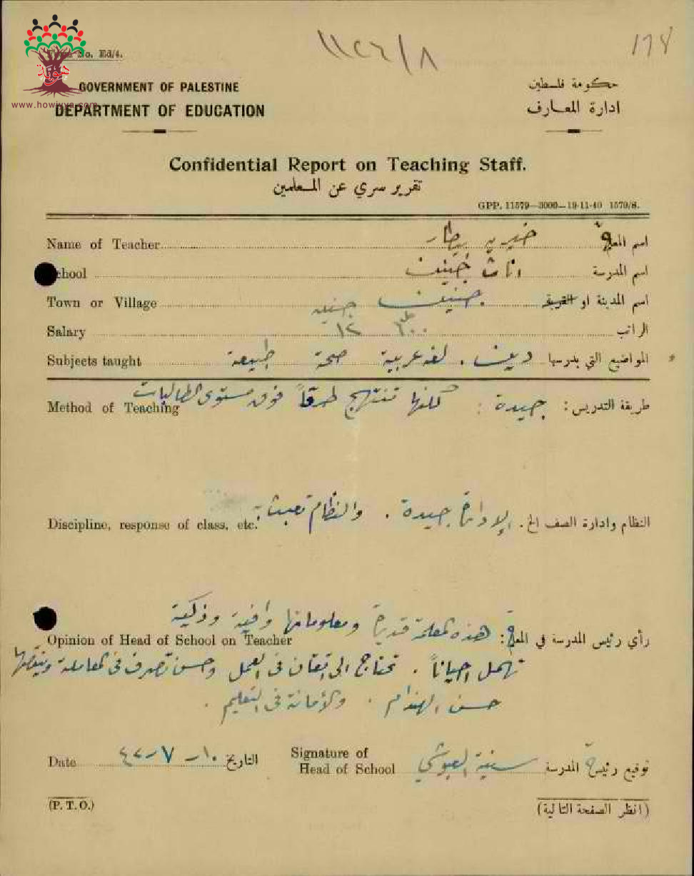 تقرير تفصيلي عن أداء المعلمة خيرية بيطار في مدرسة جنين سنة 1942