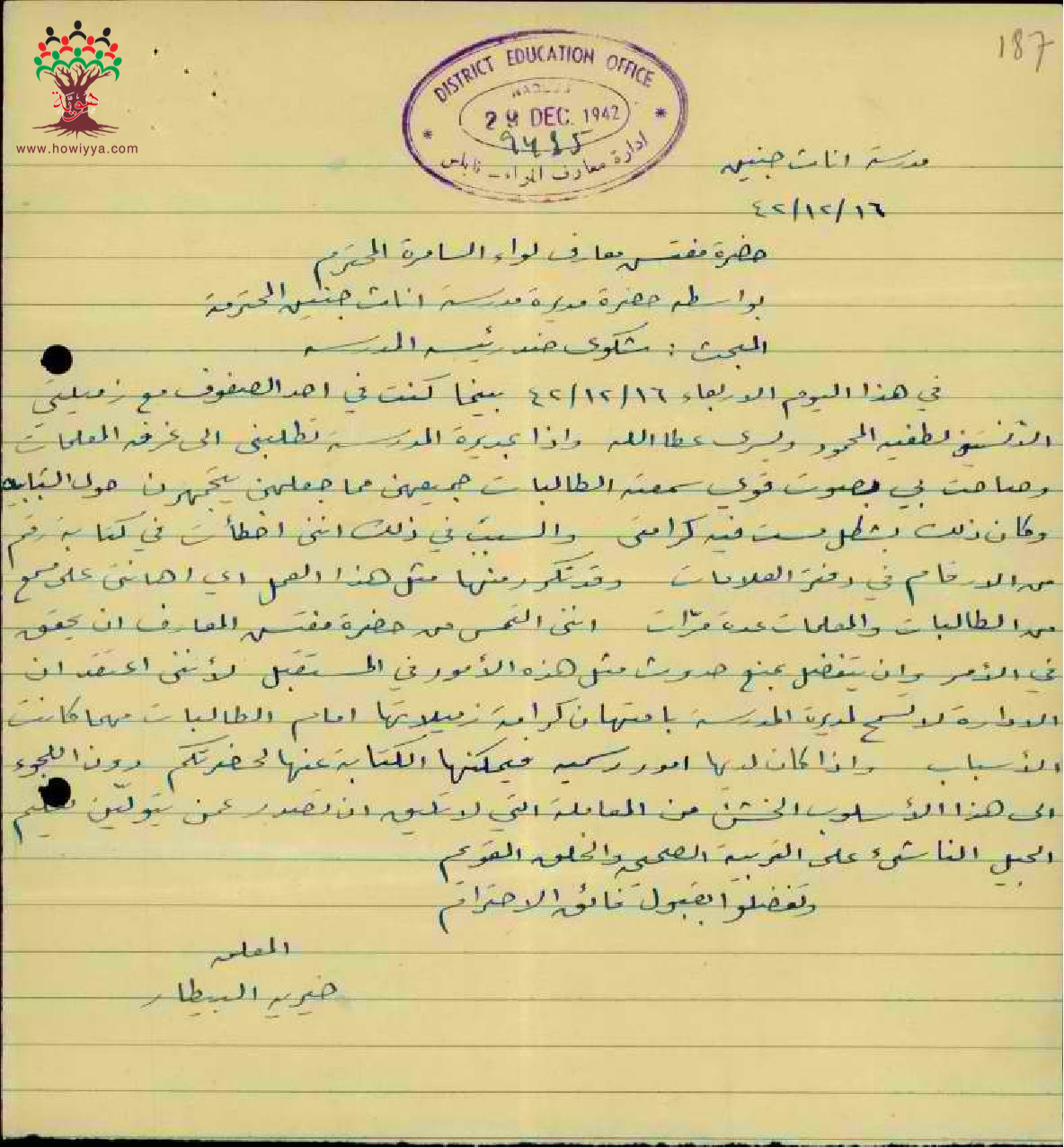 شكوى مقدمة من المعلمة خيرية بيطار على مديرة المدرسة