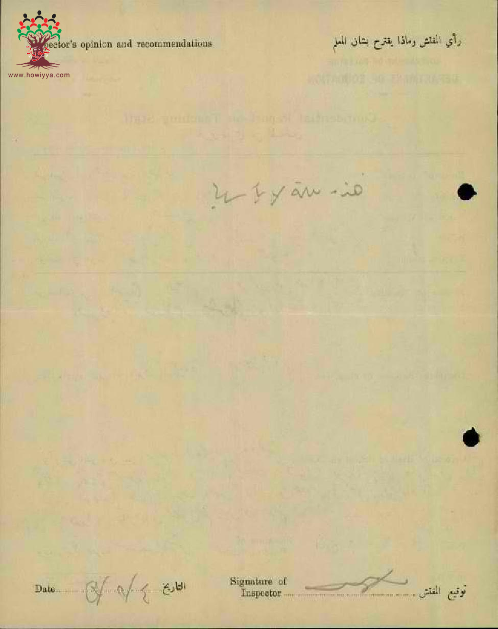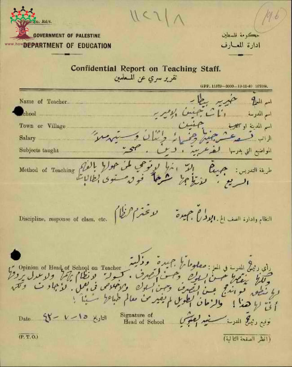 تقرير تفصيلي عن أداء المعلمة خيرية بيطار في مدرسة جنين سنة 1943