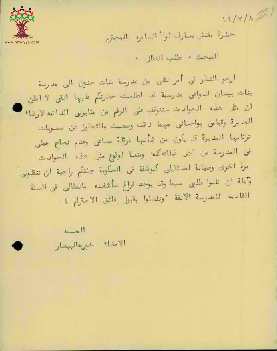 رسالة من المعلمة خيرية بيطار الى مفتش المعارف تطلب نقلها من مدرسة بنات جنين الى مدرسة بنات بيسان