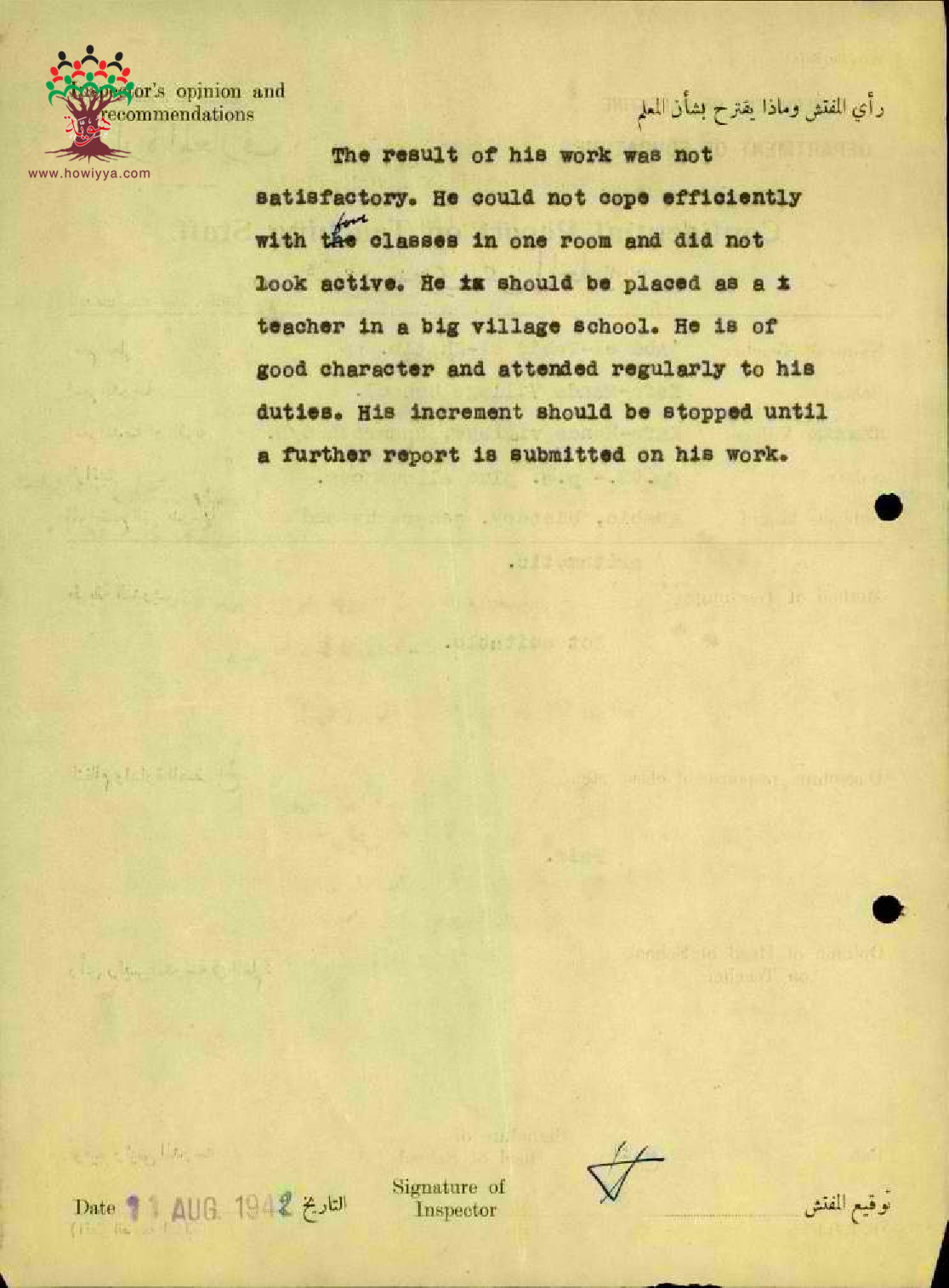 رأي المفتش العام بالمعلم عبدالواحد يونس الخطيب - حيفا - مدرسة كفرمندا
