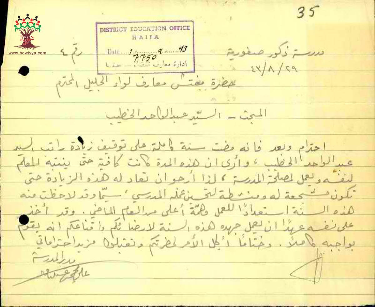 طلب مدري مدرسة صفورية زيادة مرتب المعلم عبدالواحد يونس الخطيب - حيفا