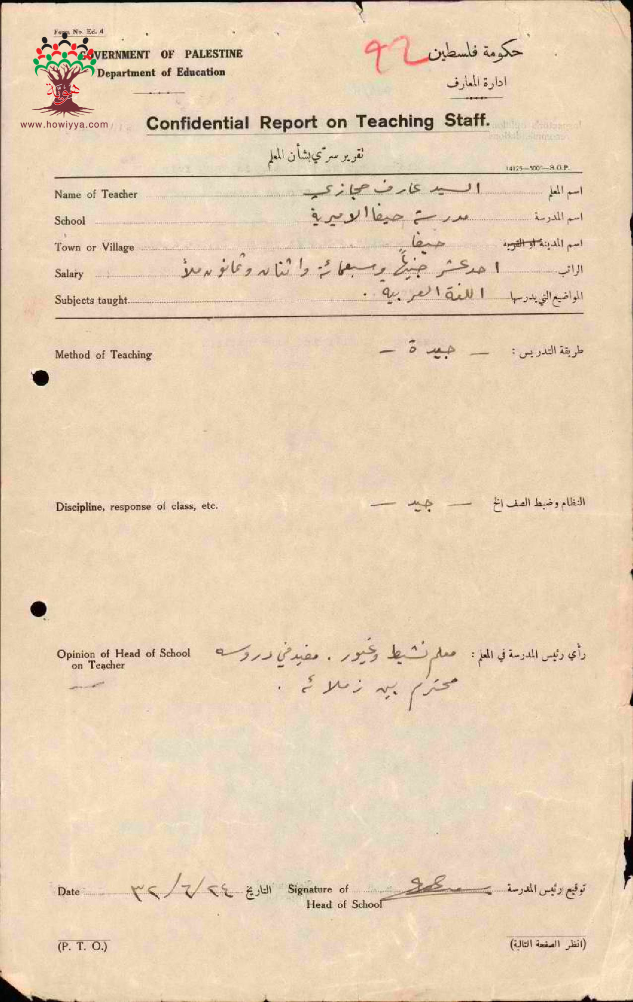 تقرير تفصيلي مقدم من قبل مدير مدرسة حيفا عن أداء المعلم عارف حجازي - صفد - مدرسة حيفا