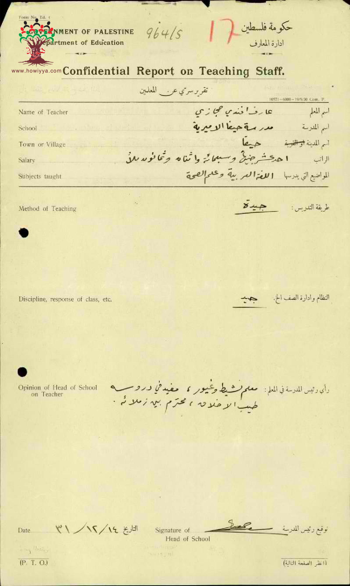 تقرير تفصيلي مقدم من قبل مدير مدرسة حيفا عن أداء المعلم عارف حجازي - صفد - مدرسة حيفا