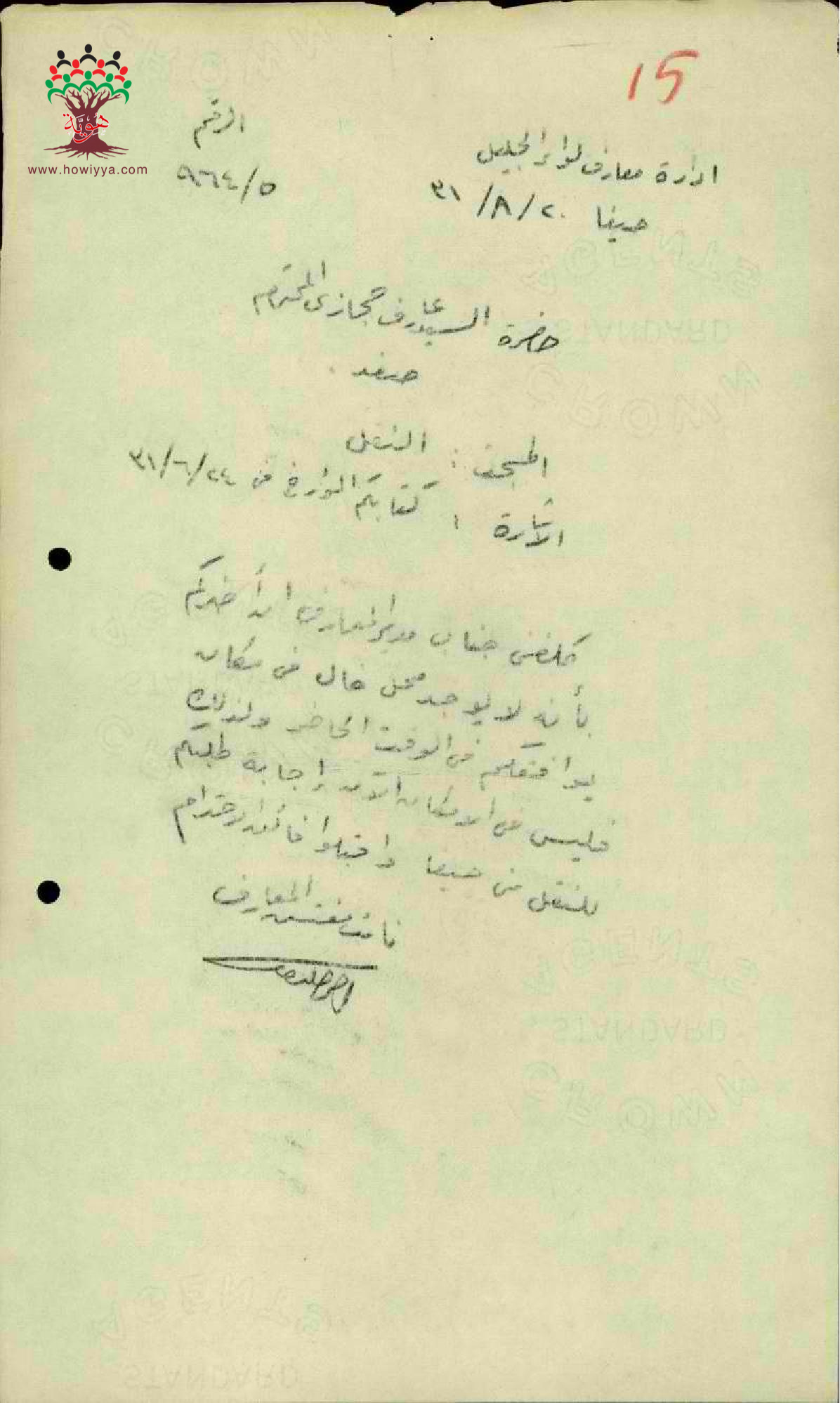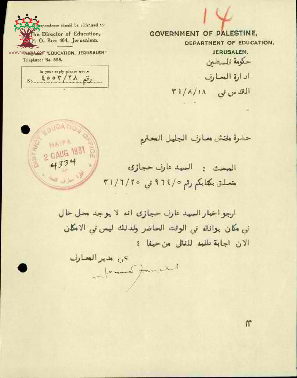 رد ادارة المعارف على طلب نقل المقدم من قبل المعلم عارف حجازي - صفد - مدرسة حيفا
