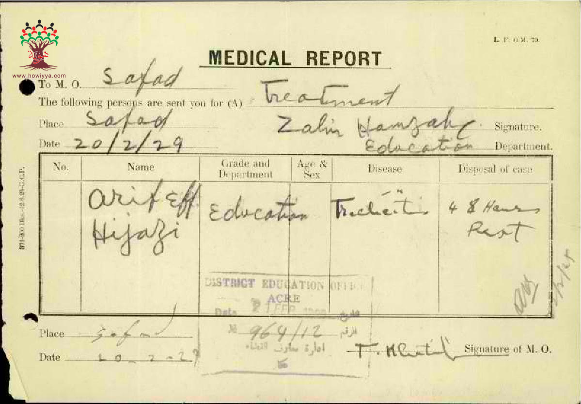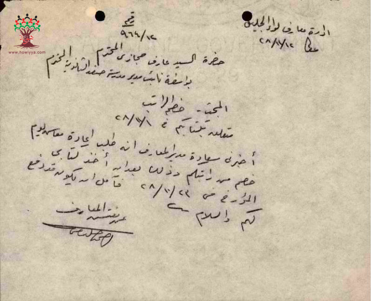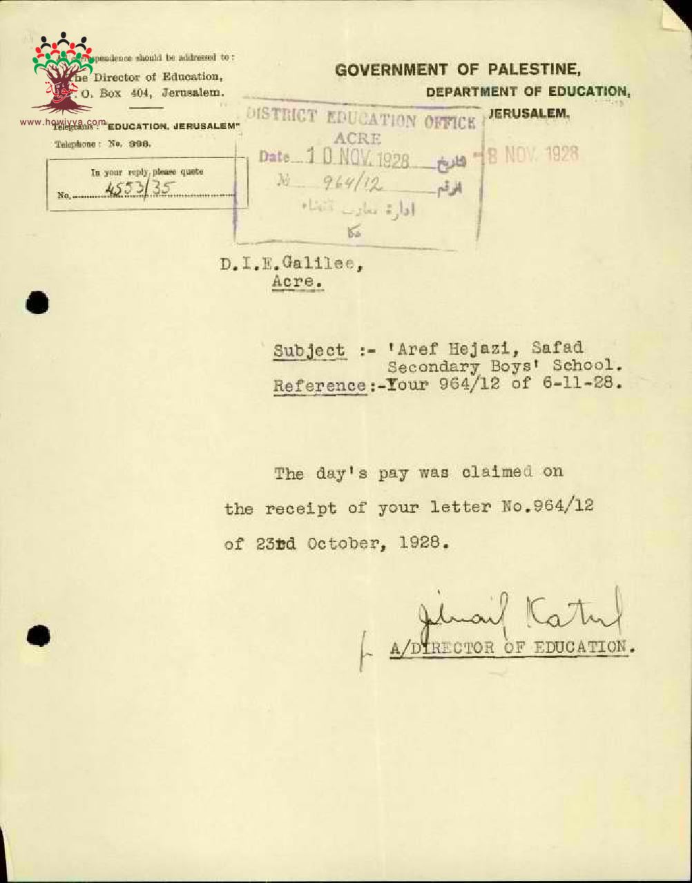 خصم يوم العطلة من راتب المعلم عارف حجازي بسبب غيابه عن المدرسة - صفد مدرسة حيفا