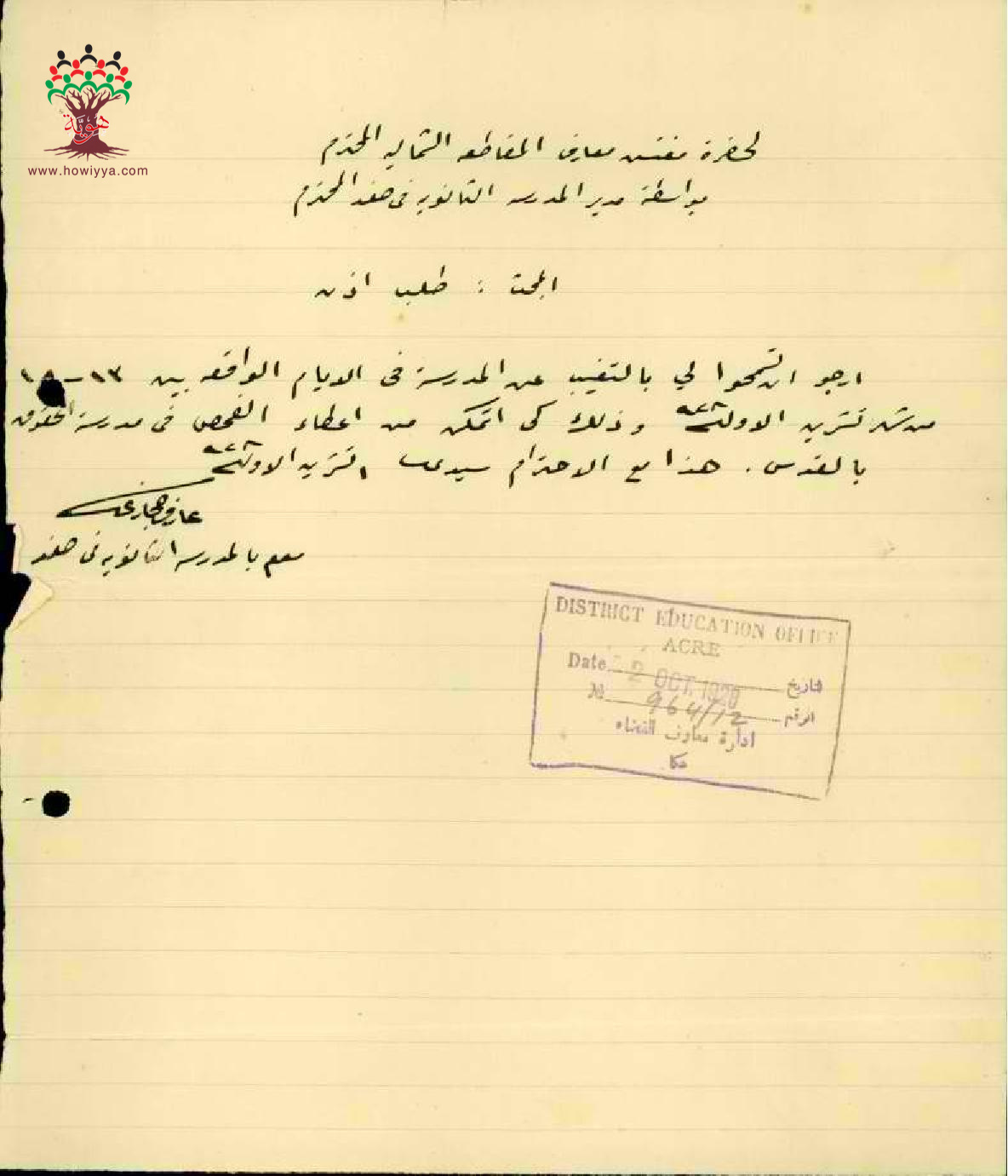 اعتراض المعلم عارف حجازي بسبب خصم في الراتب اثناء اجراء امتحان الحقوق - صفد - مدرسة حيفا