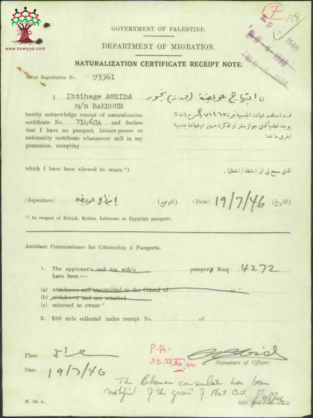 إيصال موقع من ابتهاج عويضة بخور باستلام شهادة الجنسية الفلسطينية