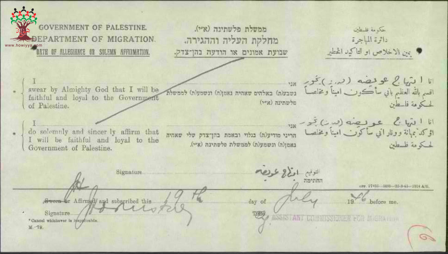 ابتهاج عويضة بخور توقع على (يمين الإخلاص) للحصول على الجنسية الفلسطينية