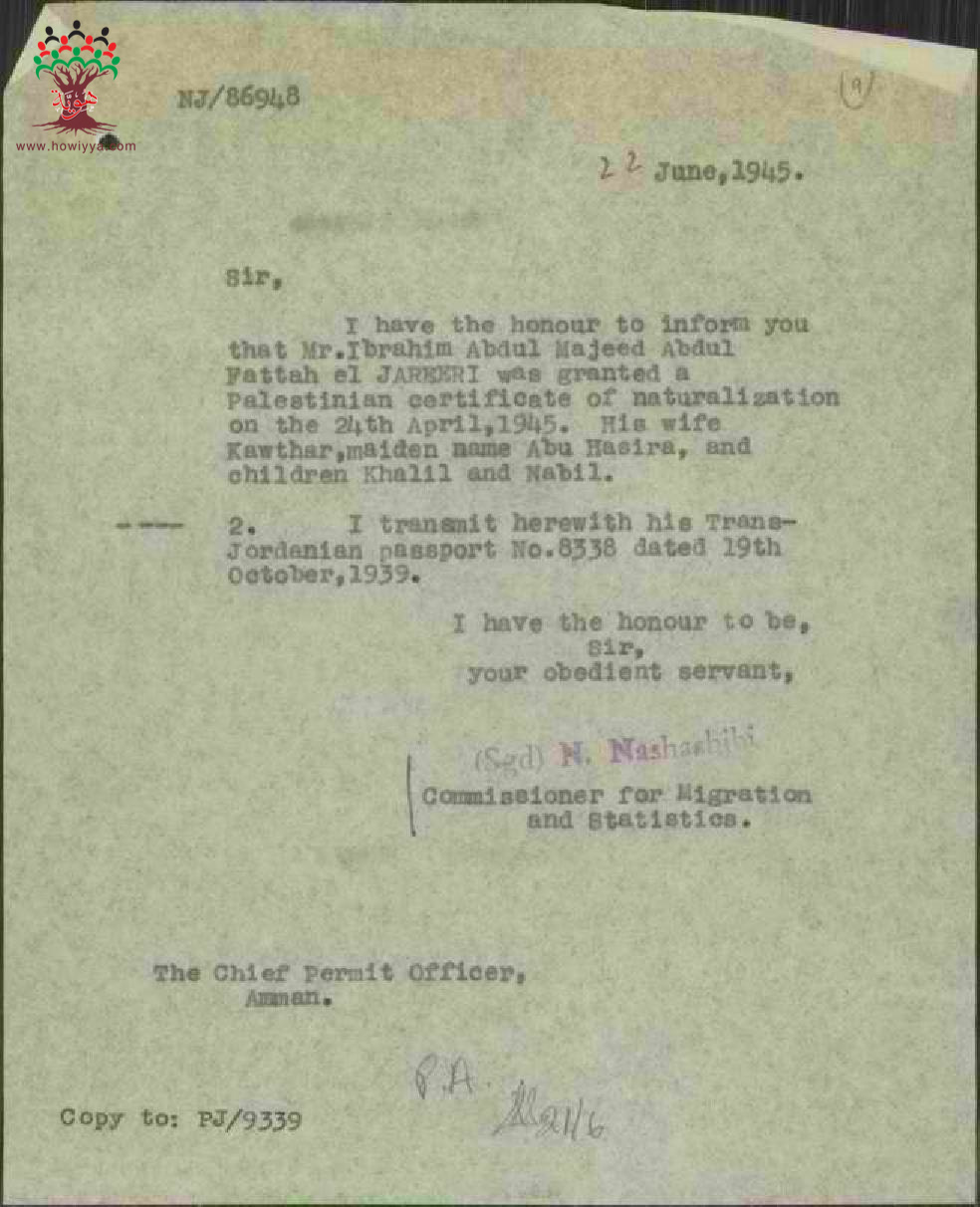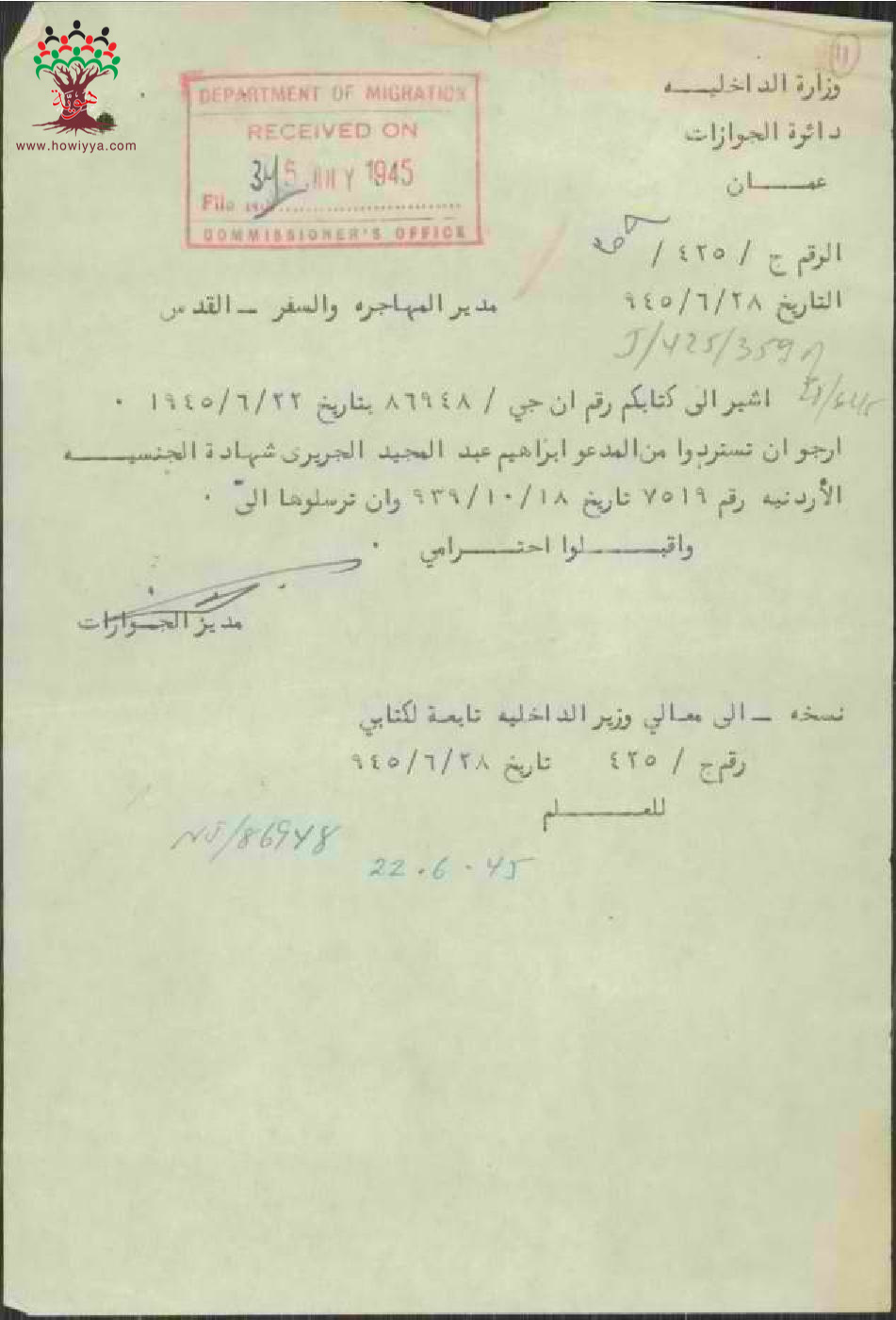 مجموعة رسائل بخصوص تسليم ابراهيم الجريري جنسيته الأردنية الى دائرة المهاجرة والسفر