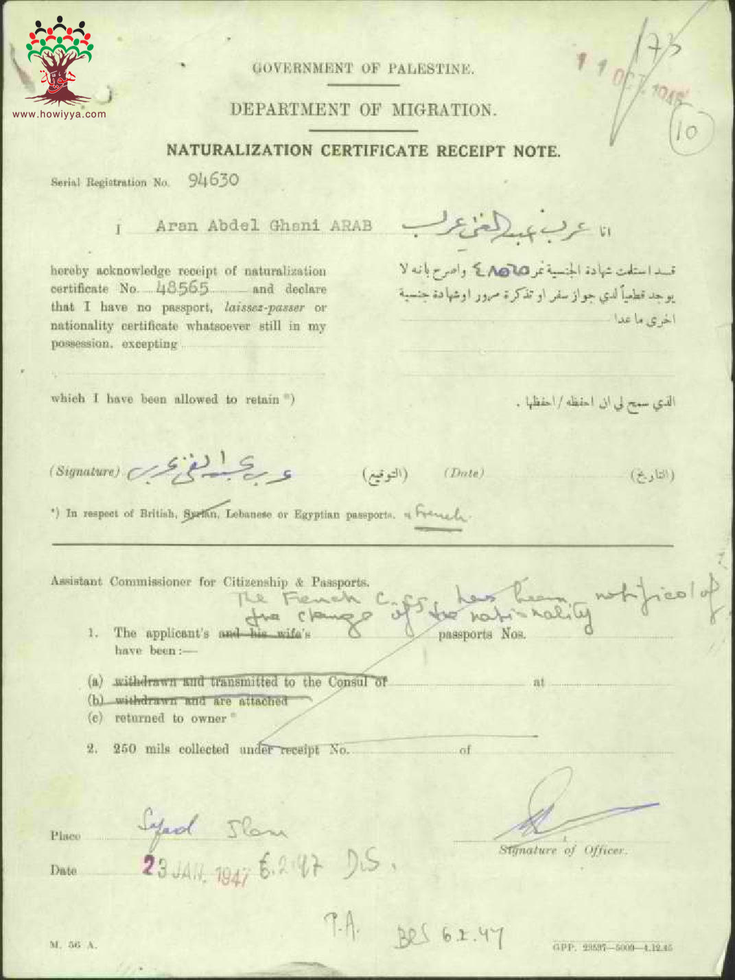 إيصال موقع من عرب عبد الغني عرب باستلام شهادة الجنسية الفلسطينية