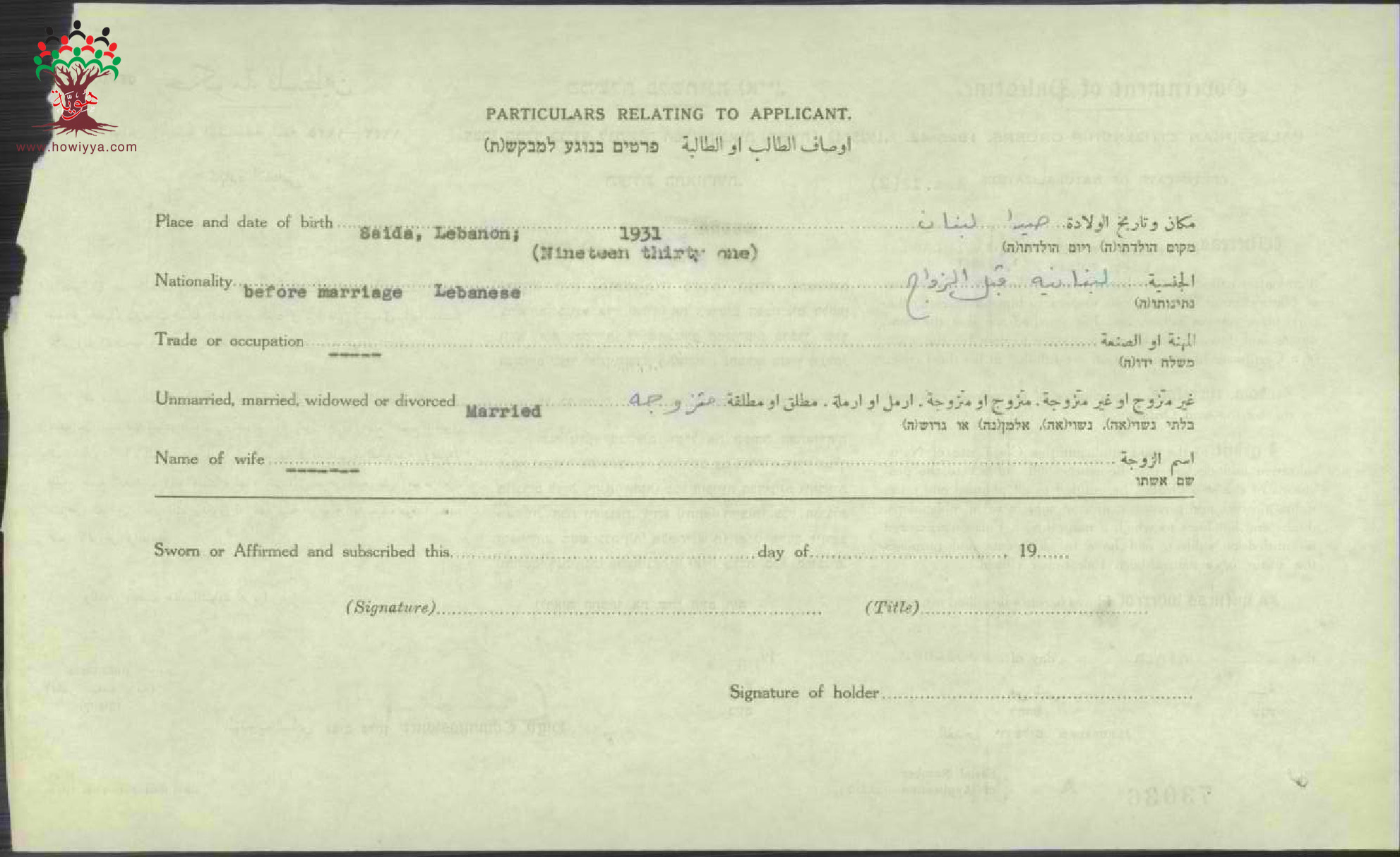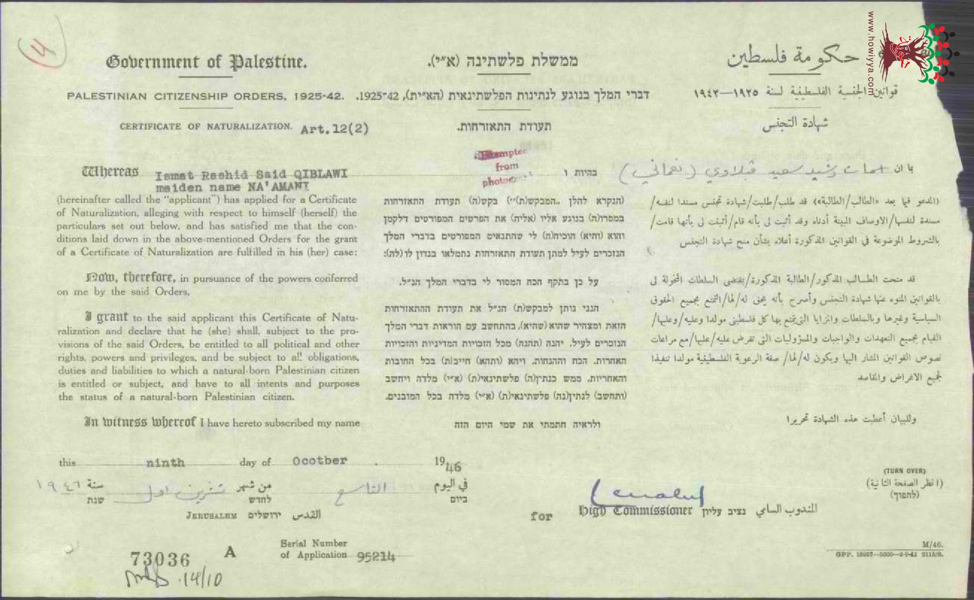 شهادة الجنسية الفلسطينية ل إسمات قبلاوي نعماني
