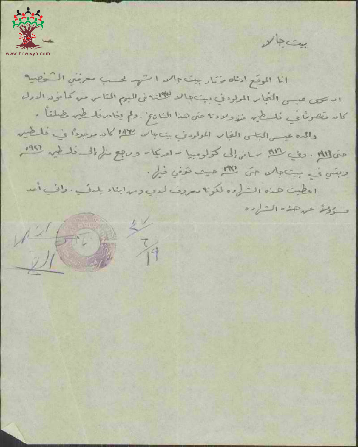شهادة من المختار ل موسى نجار بخصوص طلب الجنسية/بيت جالا