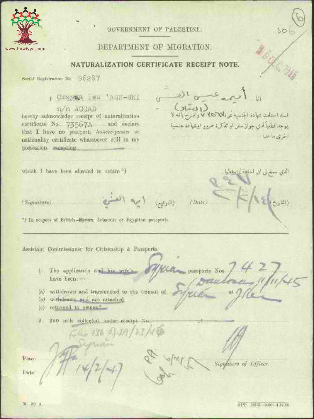 إيصال موقع من أميمة العشي باستلام شهادة الجنسية الفلسطينية