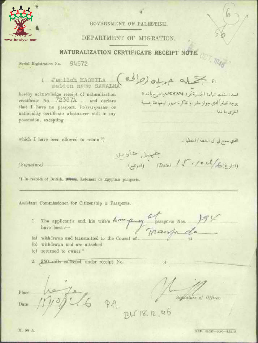 إيصال موقع من جميلة صوالحة حويلة باستلام شهادة الجنسية الفلسطينية