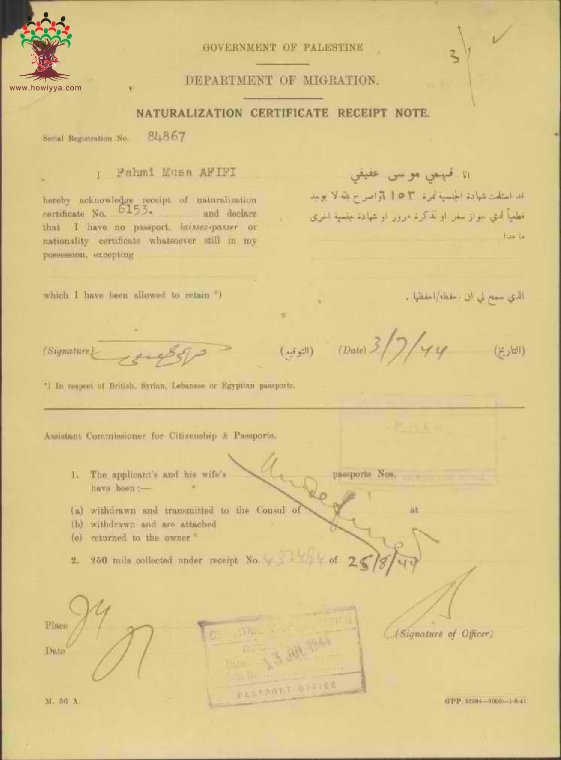 إيصال موقع من فهمي العفيفي باستلام شهادة الجنسية الفلسطينية