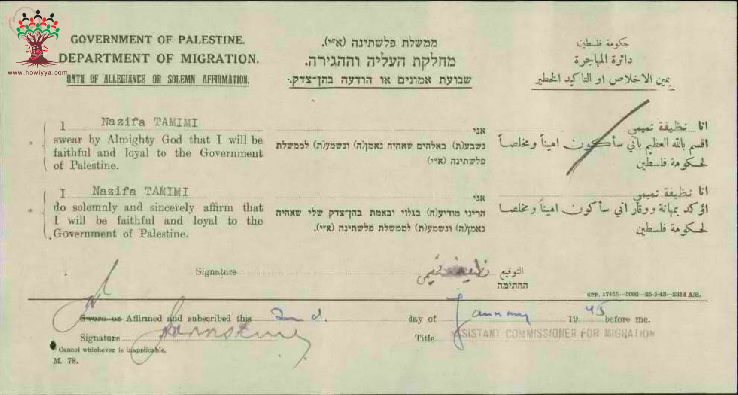 نظيفة التميمي توقع على (يمين الإخلاص) للحصول على الجنسية الفلسطينية