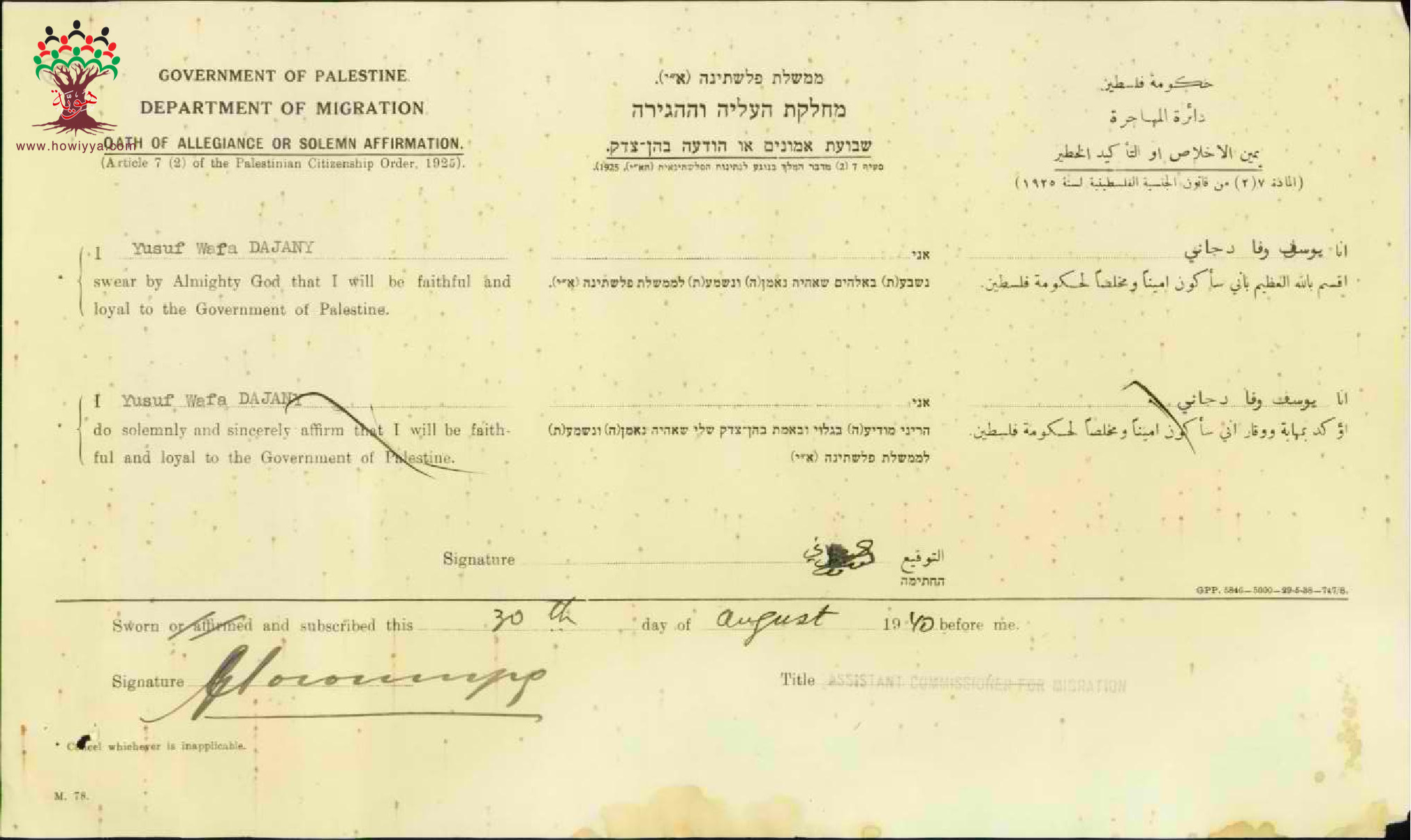 يوسف الدجاني يوقع على (يمين الإخلاص) للحصول على الجنسية الفلسطينية