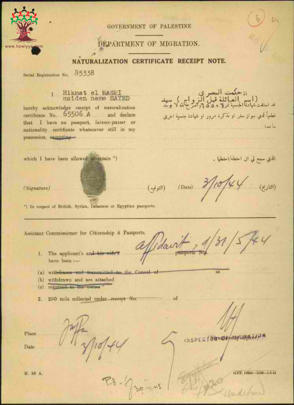 إيصال موقع من حكمت سيد المصري باستلام شهادة الجنسية الفلسطينية