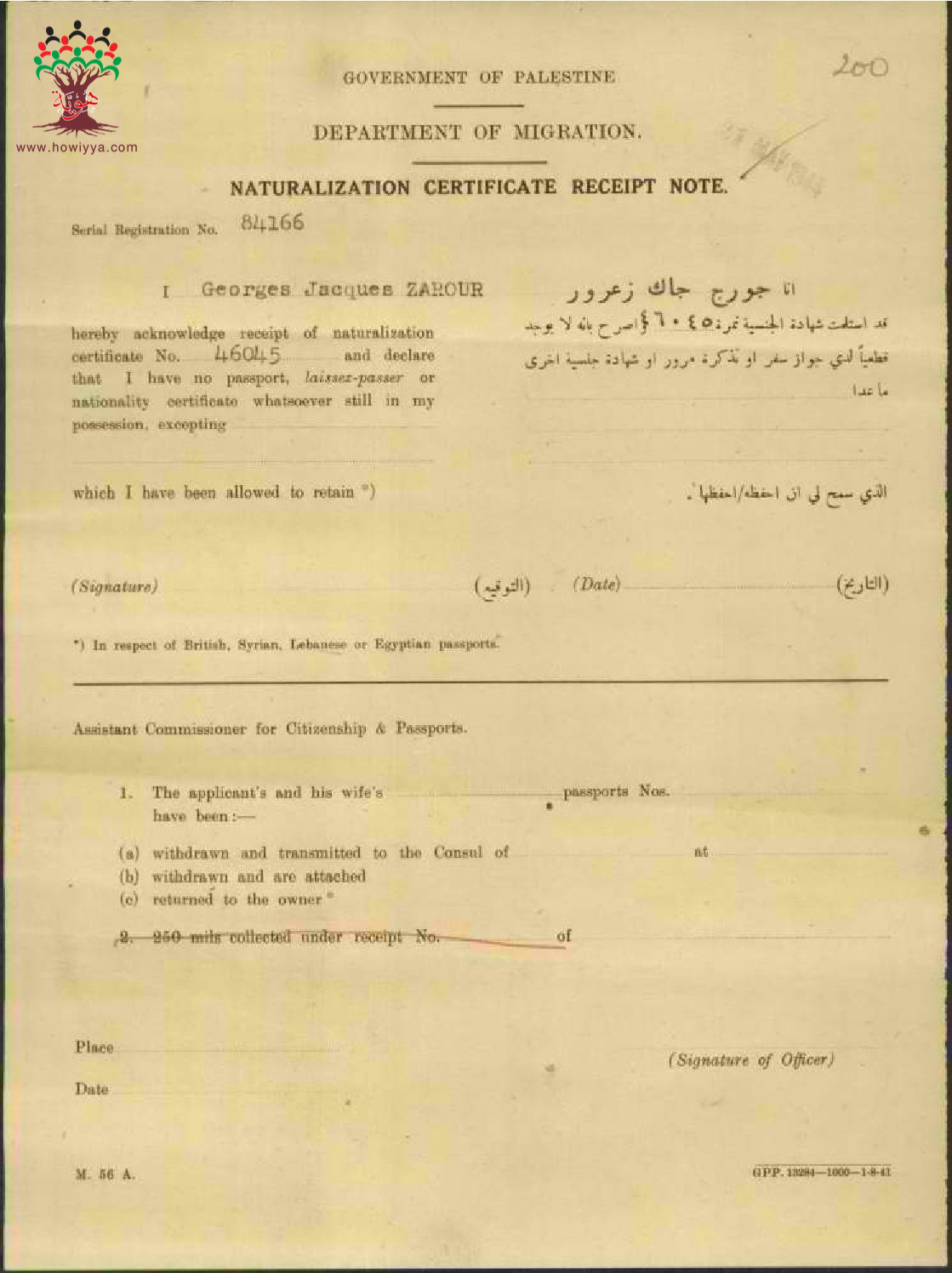 إيصال موقع من جورج زعرور باستلام شهادة الجنسية الفلسطينية