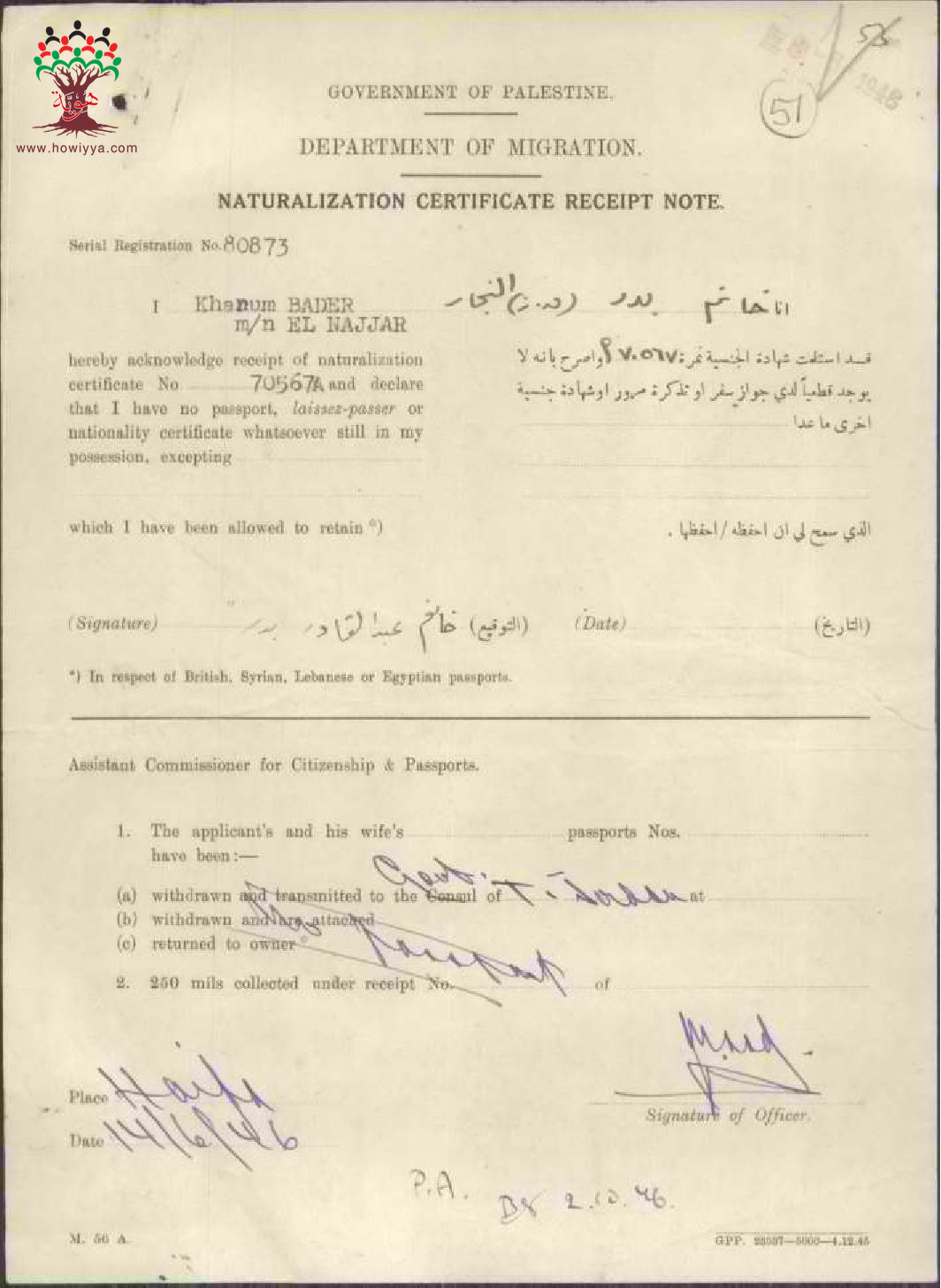إيصال موقع من خانم نجار باستلام شهادة الجنسية الفلسطينية