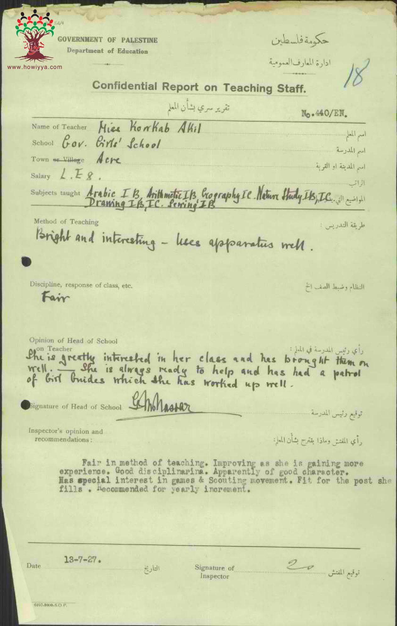 تقرير تفصيلي عن أداء المعلمة كوكب عاقل في مدرسة عكا سنة 1927
