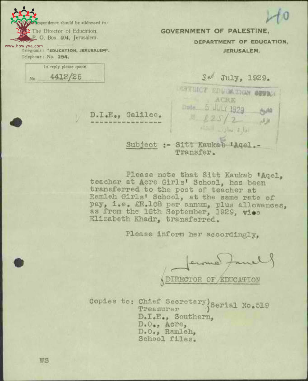 رسالة من مدير المعارف الى مفتش المعارف بخصوص نقل المعلمة كوكب عاقل الى مدرسة الرملة