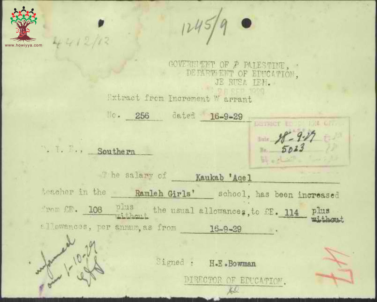 رسالة من مدير المعارف الى مفتش المعارف بخصوص زيادة راتب المعلمة كوكب عاقل السنوية
