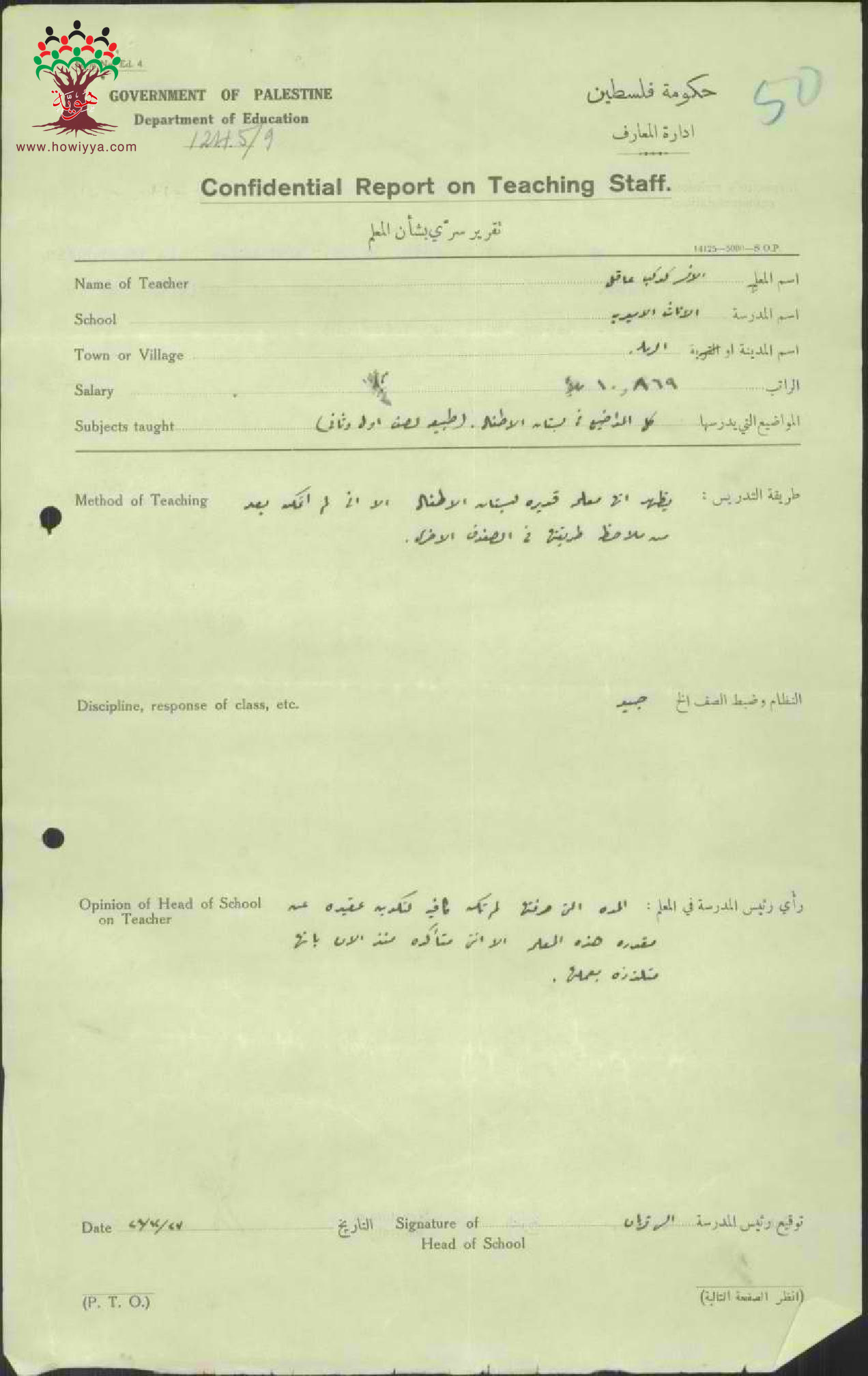 تقرير تفصيلي عن أداء المعلمة كوكب عاقل في مدرسة عكا سنة 1929