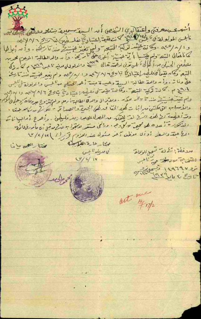 شهاد من المختار للسيدة سميرة أحمد حنبلي بخصوص طلب الجنسية / نابلس