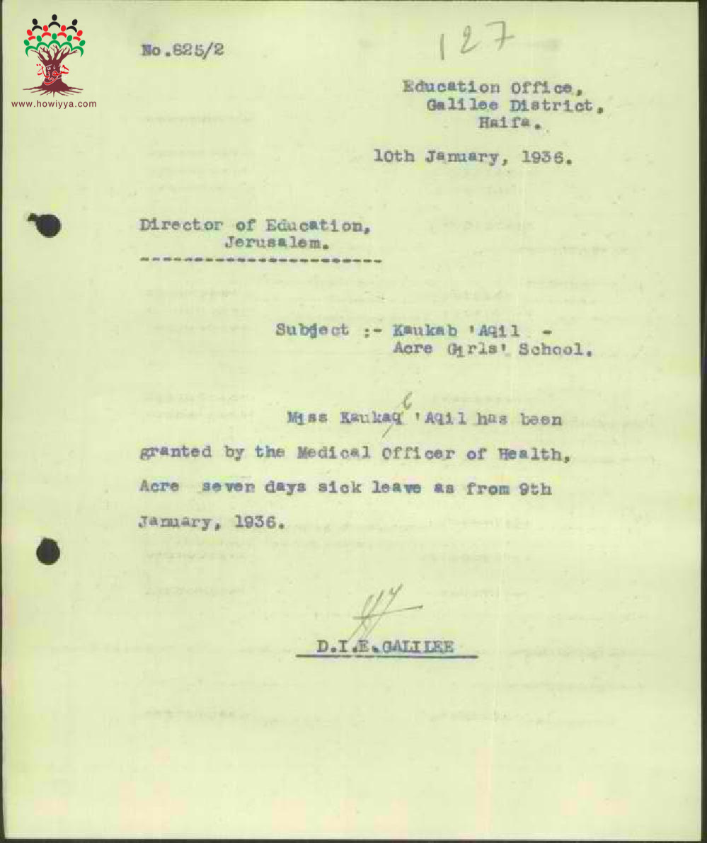 رسالة من مفتش المعارف الى مدير المعارف بخصوص اجازة مرضية للمعلمة كوكب عاقل