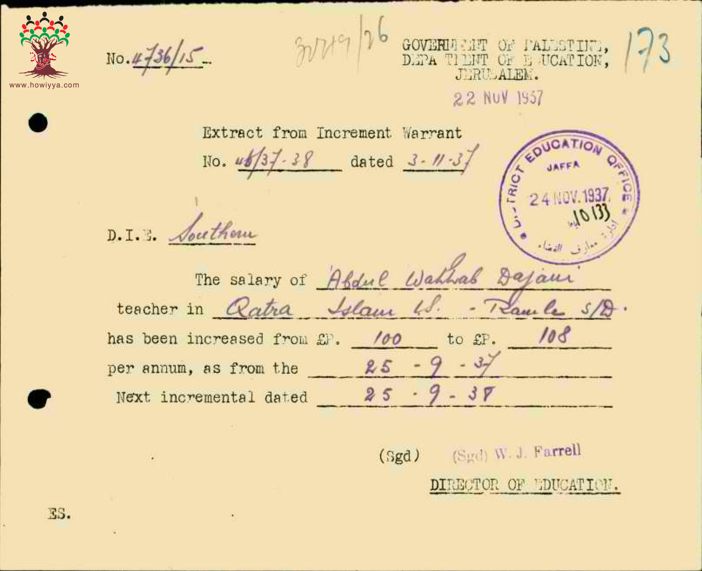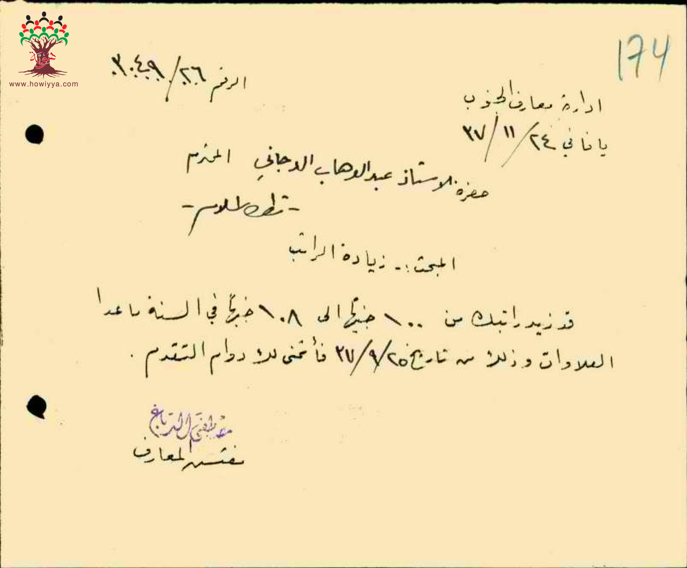 رسائل بخصوص زيادة راتب المعلم عبد الوهاب الدجاني السنوية