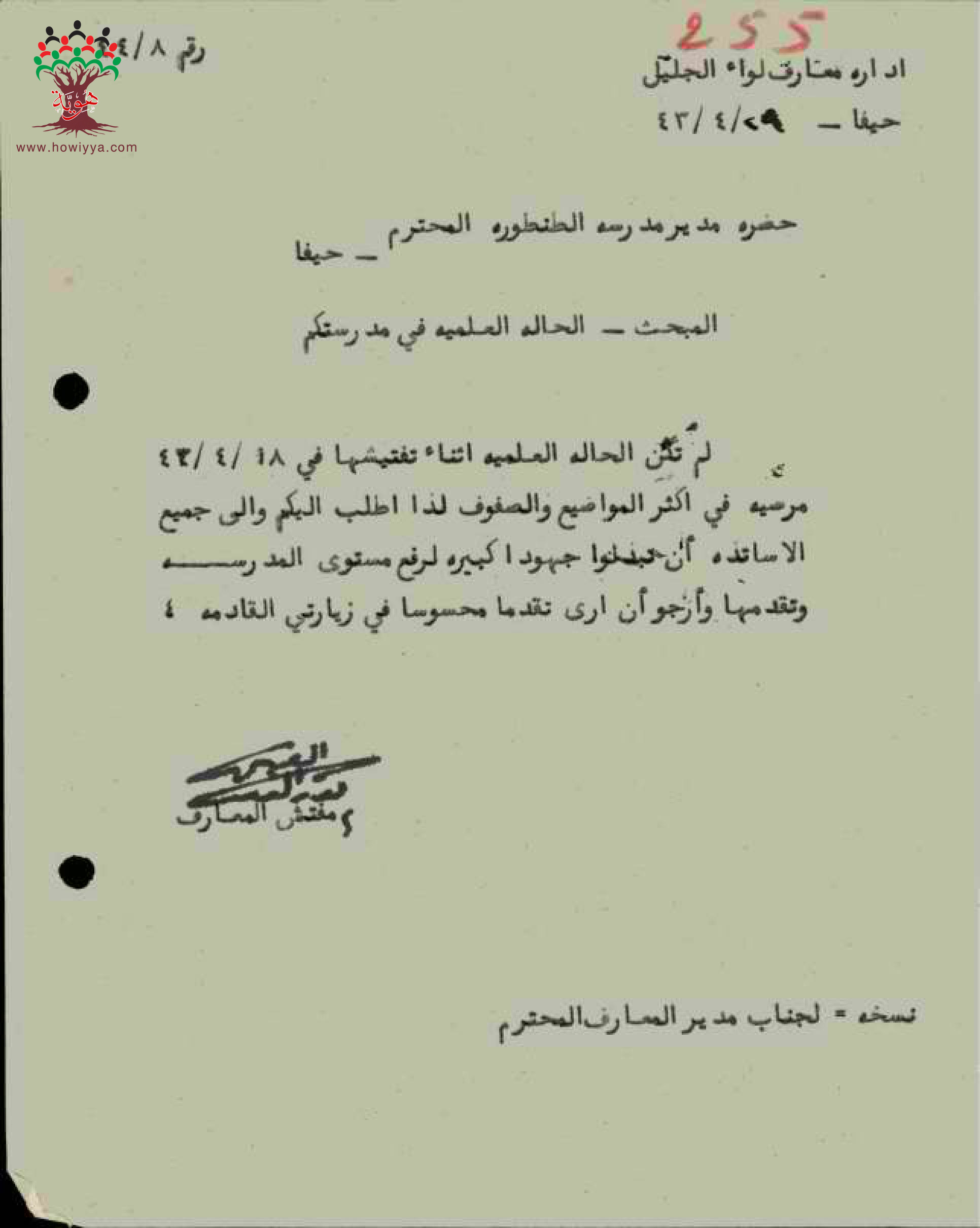 تقرير تفصيلي عن أداء المعلم عبد الوهاب الدجاني في مدرسة الطنطورة سنة 1942