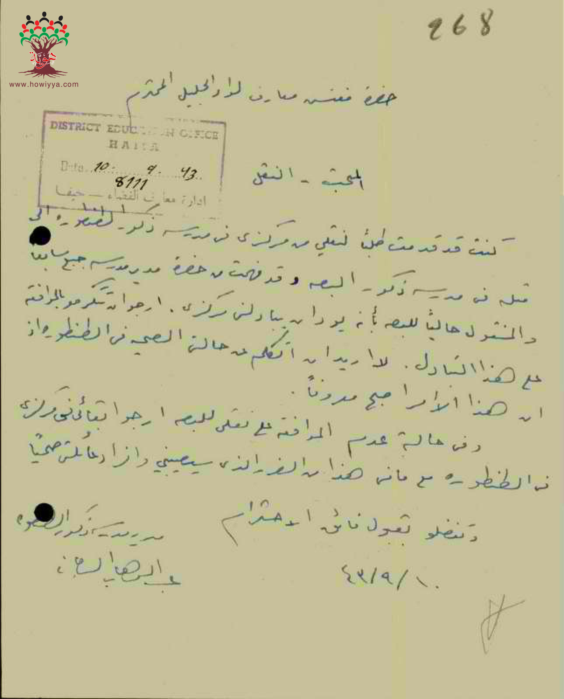 رسالة من المعلم عبد الوهاب الدجاني الى مفتش المعارف يطلب فيها نقله من مدرسة الطنطورة الى مدرسة البصة