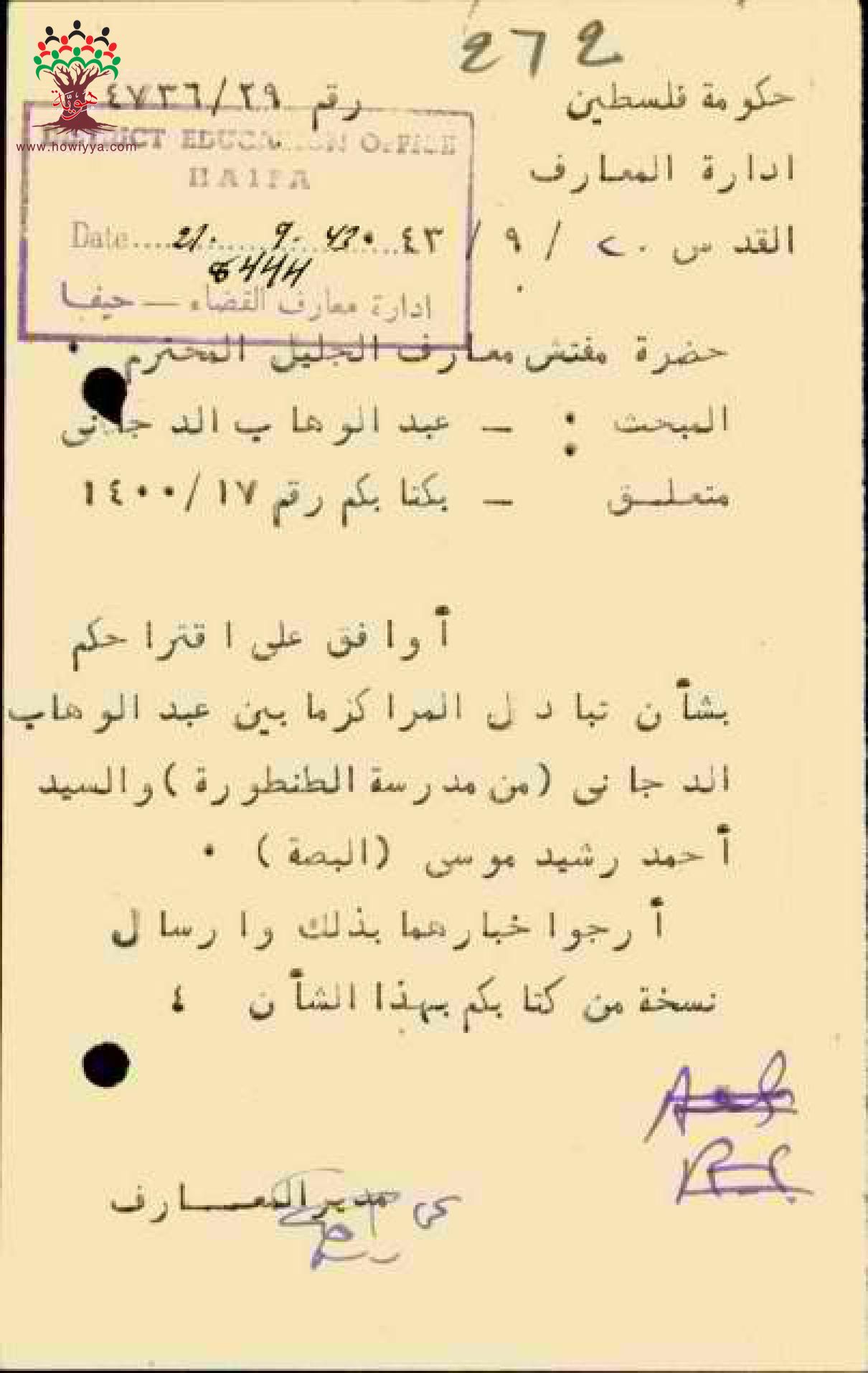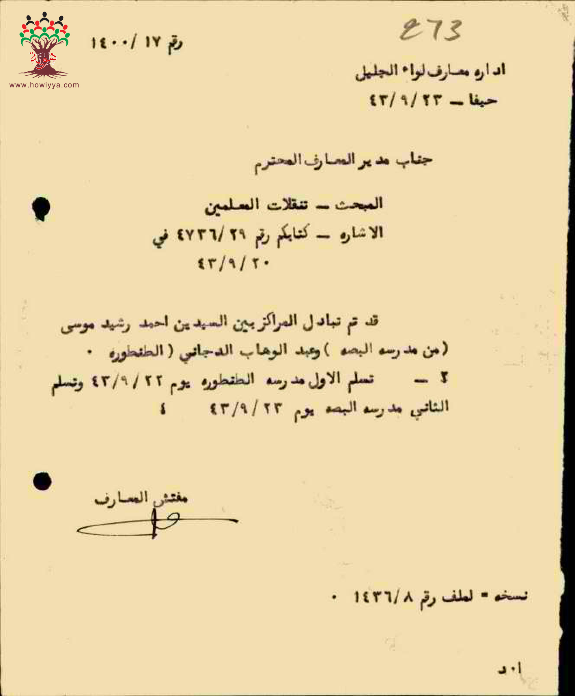 رسائل بخصوص الموافقة على نقل المعلم عبد الوهاب الدجاني من مدرسة الطنطورة الى مدرسة البصة