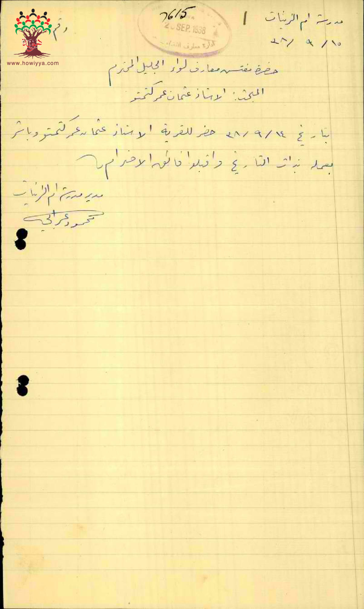 رسالة من مدير أم الزينات الى مفتش المعارف يخبره بأن المعلم عثمان كتمتو قد باشر عمله