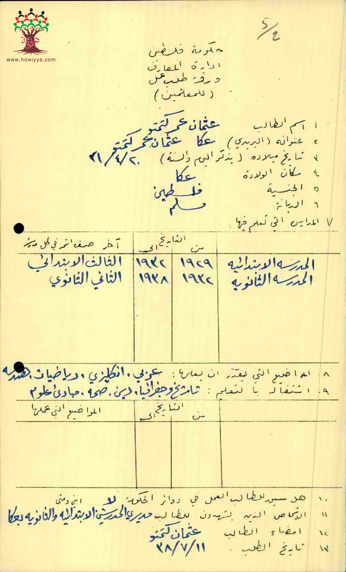 ورقة طلب عمل للمعلم عثمان كتمتو/عكا