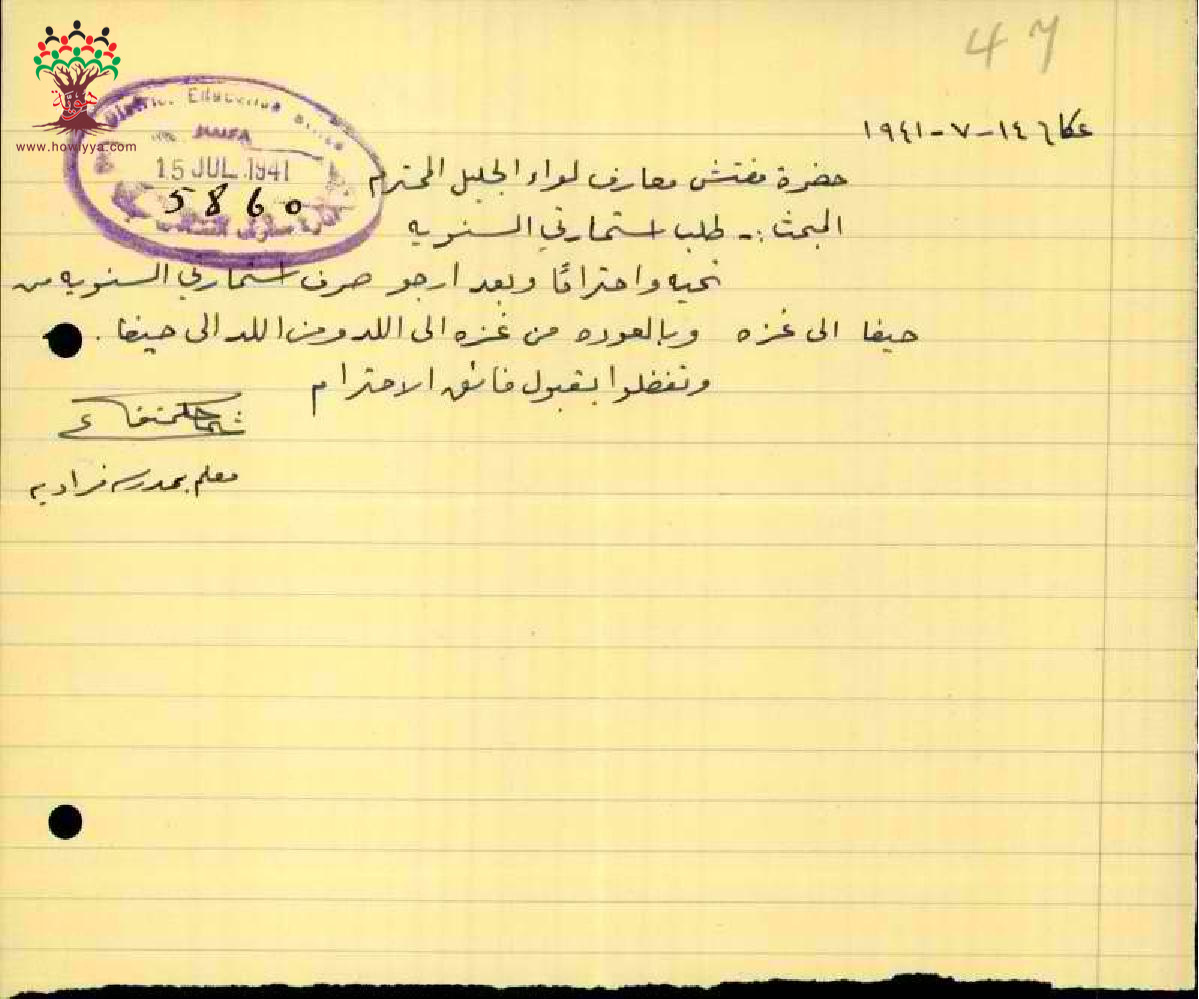 رسالة من المعلم عثمان كتمتو الى مفتش المعارف بخصوص يطلب فيها استمارة سفره السنوية