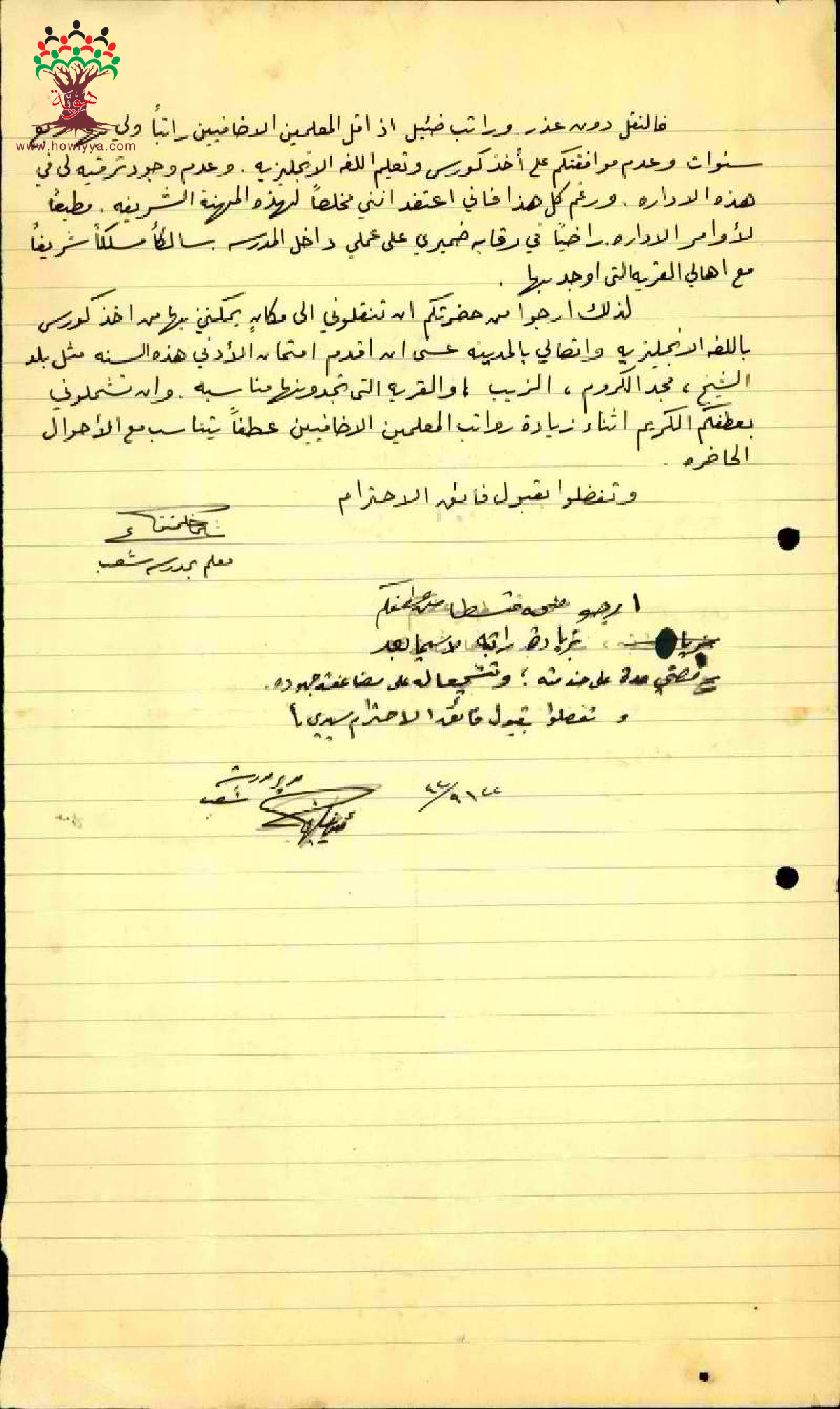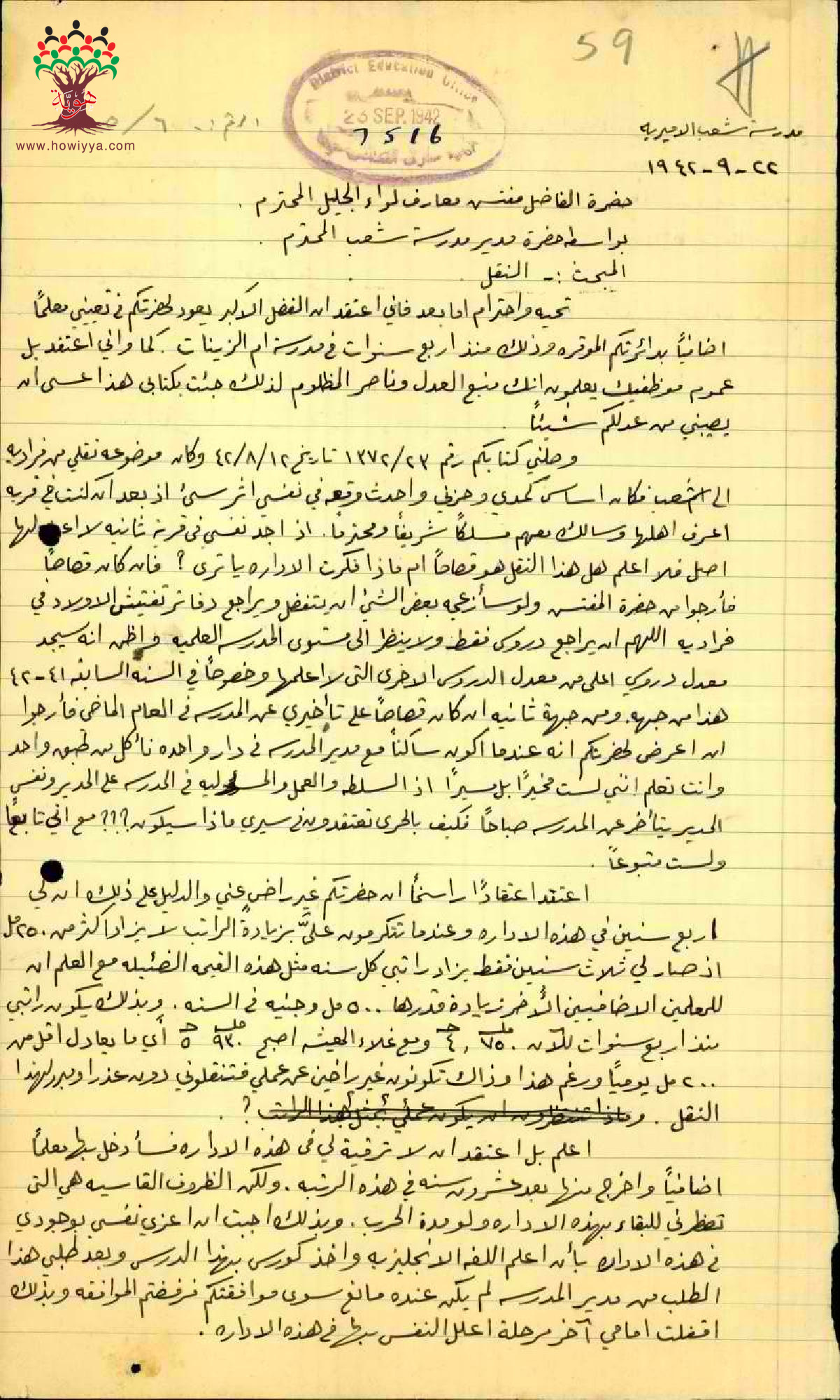 رسالة من المعلم عثمان كتمتو الى مفتش المعارف بخصوص نقله الى شعب وراتبه القليل