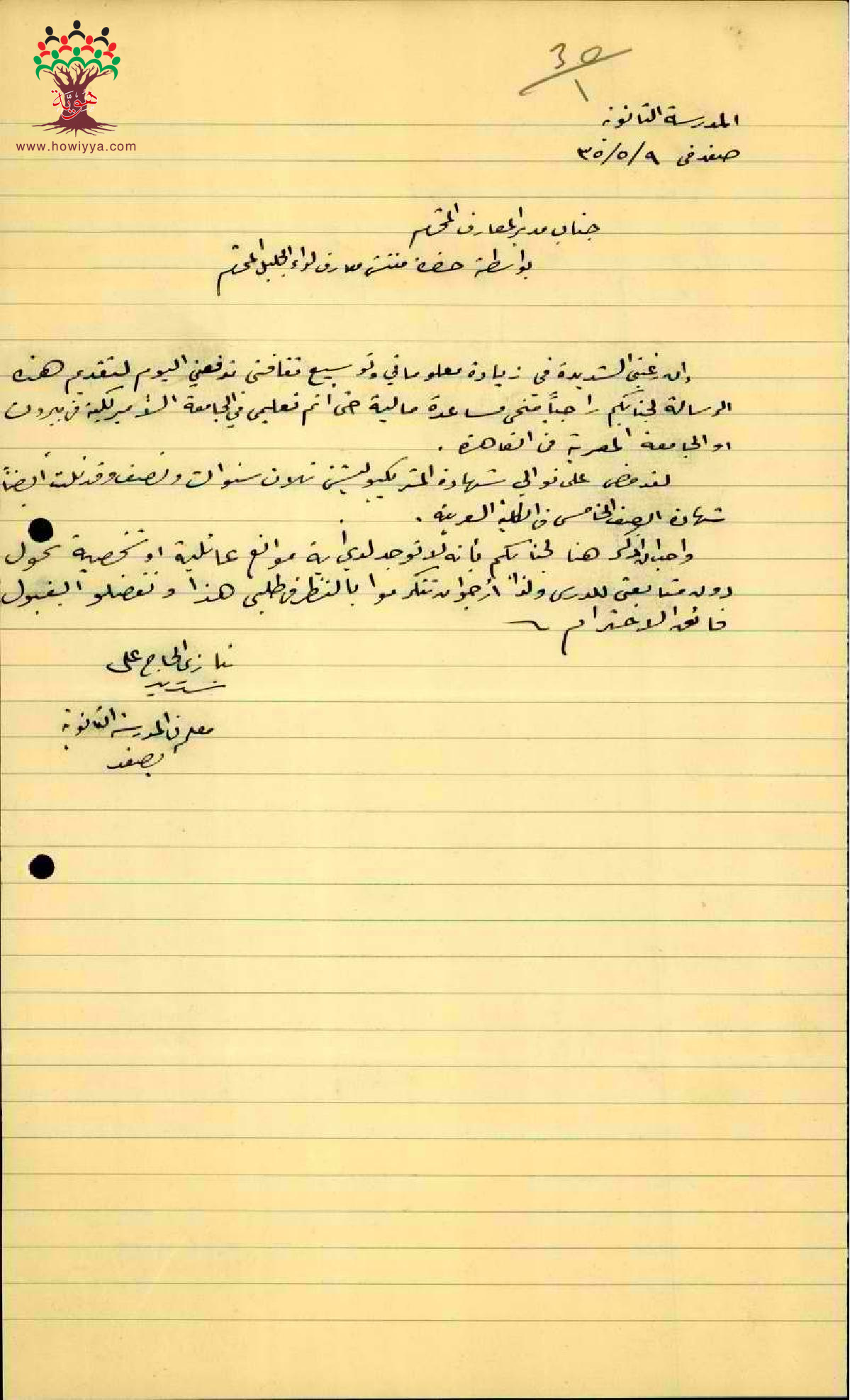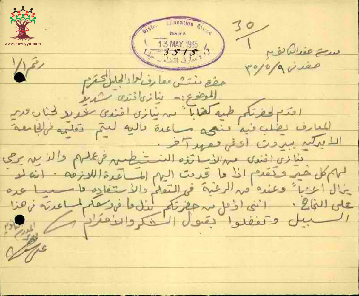 رسالة من مدير مدرسة صفد الى مفتش المعارف مرفقة برسالة من المعلم نيازي شديد يطلب فيها مساعدة مالية ليتم دراسته في الجامعة الأميركية في بيروت