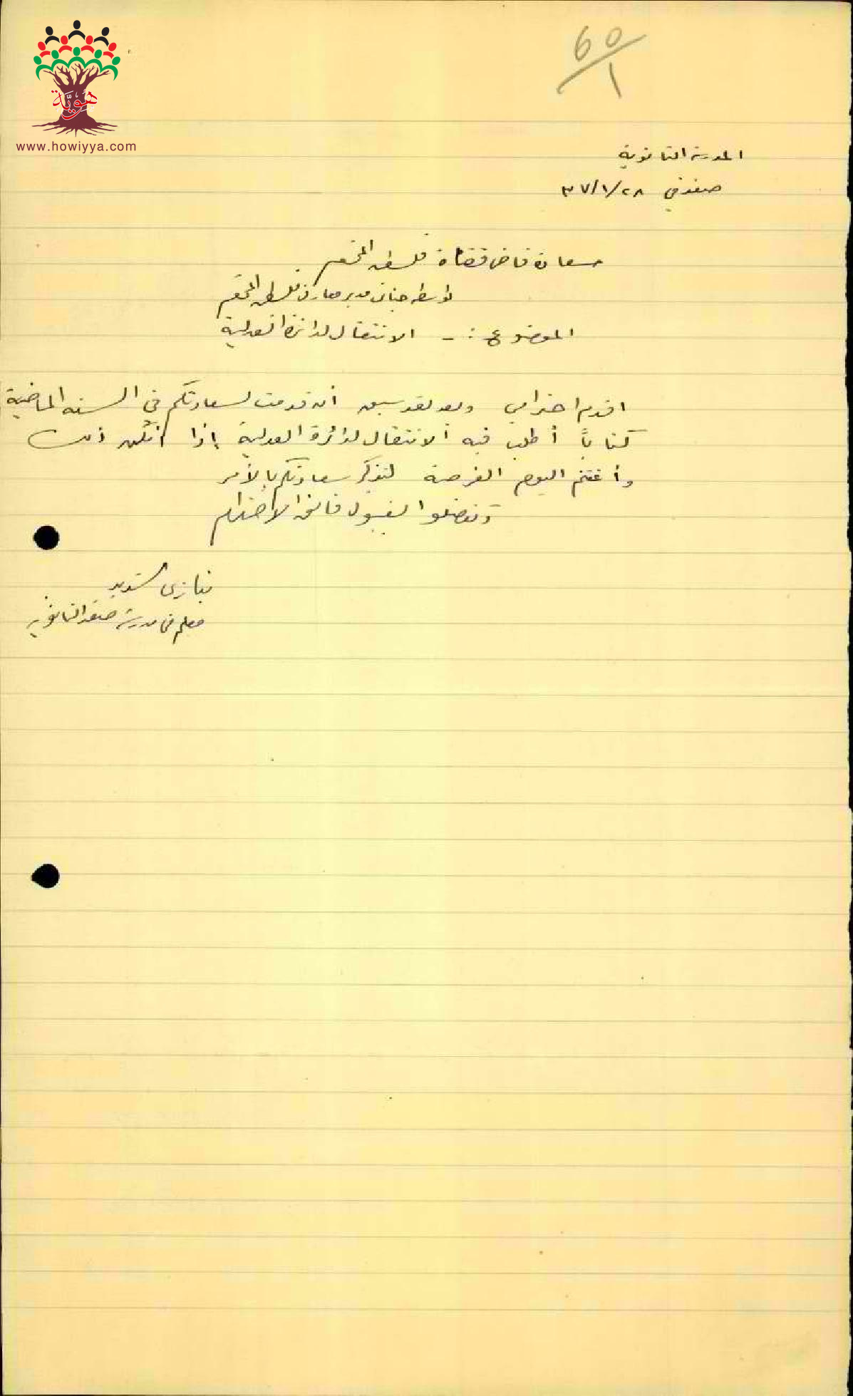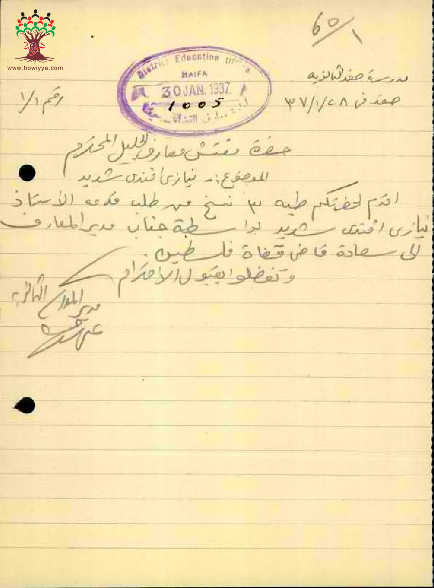 رسالة من مدير مدرسة صفد الى مفتش المعارف مرفقة بطلب المعلم نيازي شديد نقله الى دائرة العدلية