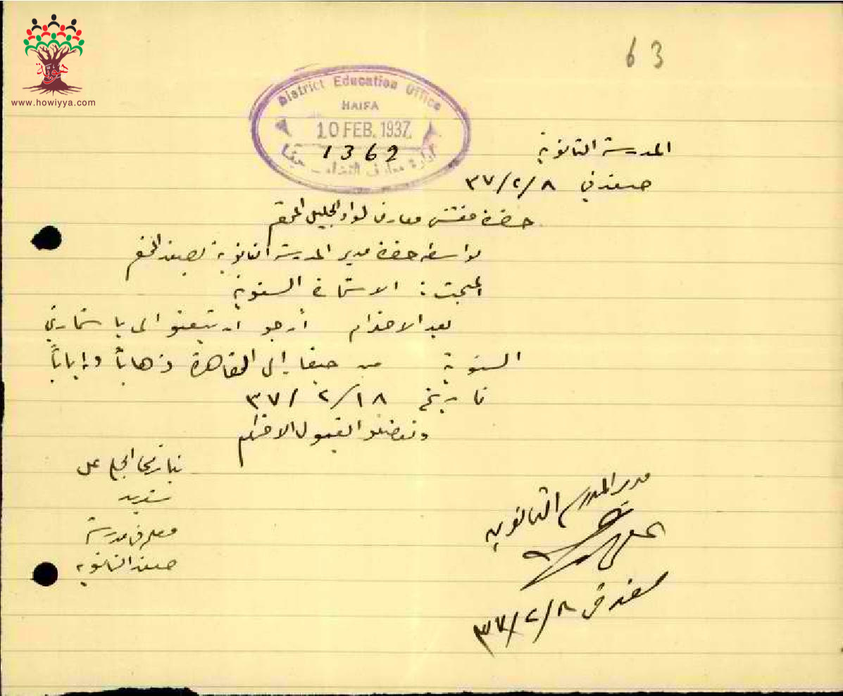رسالة من المعلم نيازي شديد الى مفتش المعارف يطلب فيها استمارة سفره السنوية