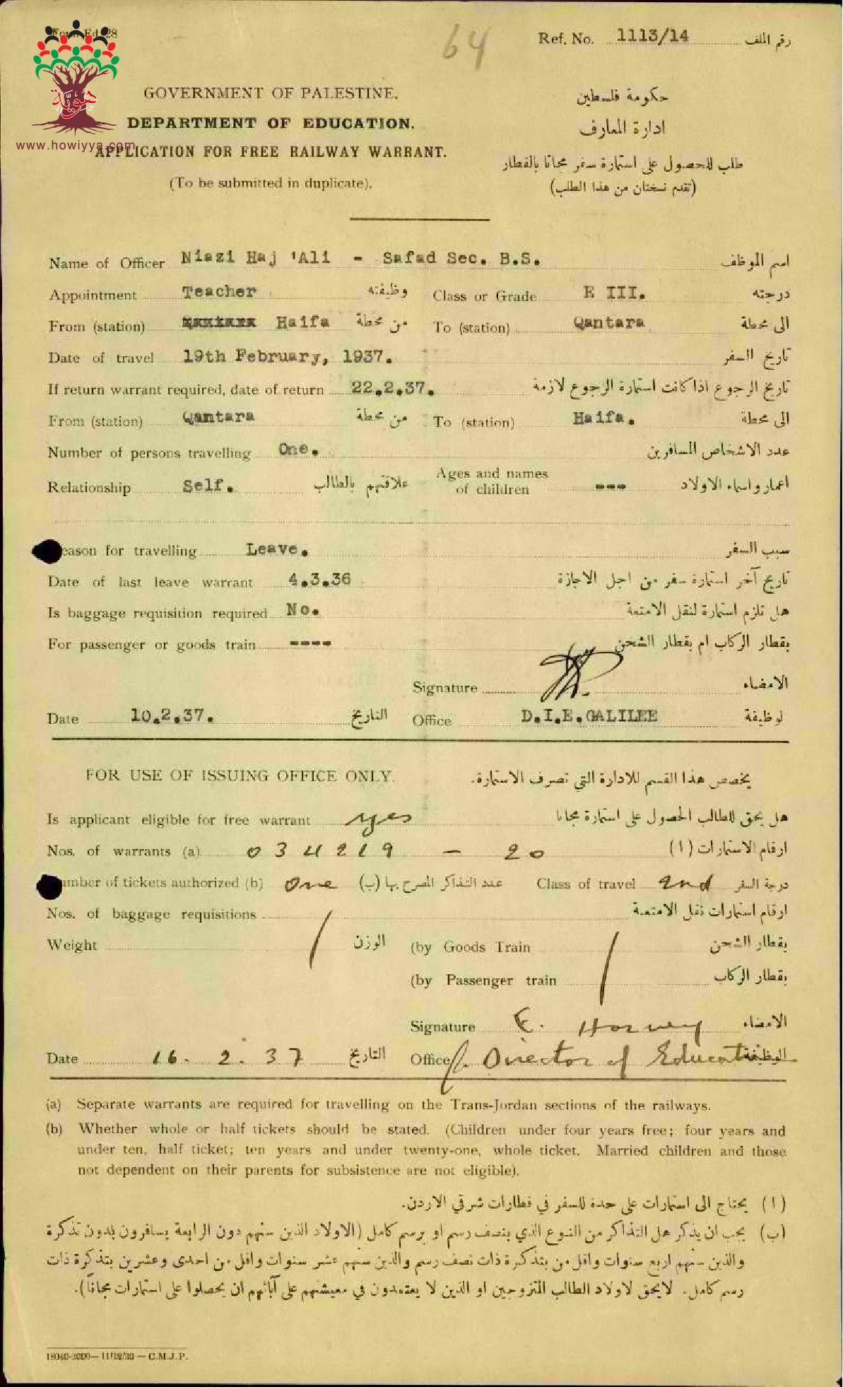 طلب استمارة سفر مقدمة من المعلم نيازي شديد/علار