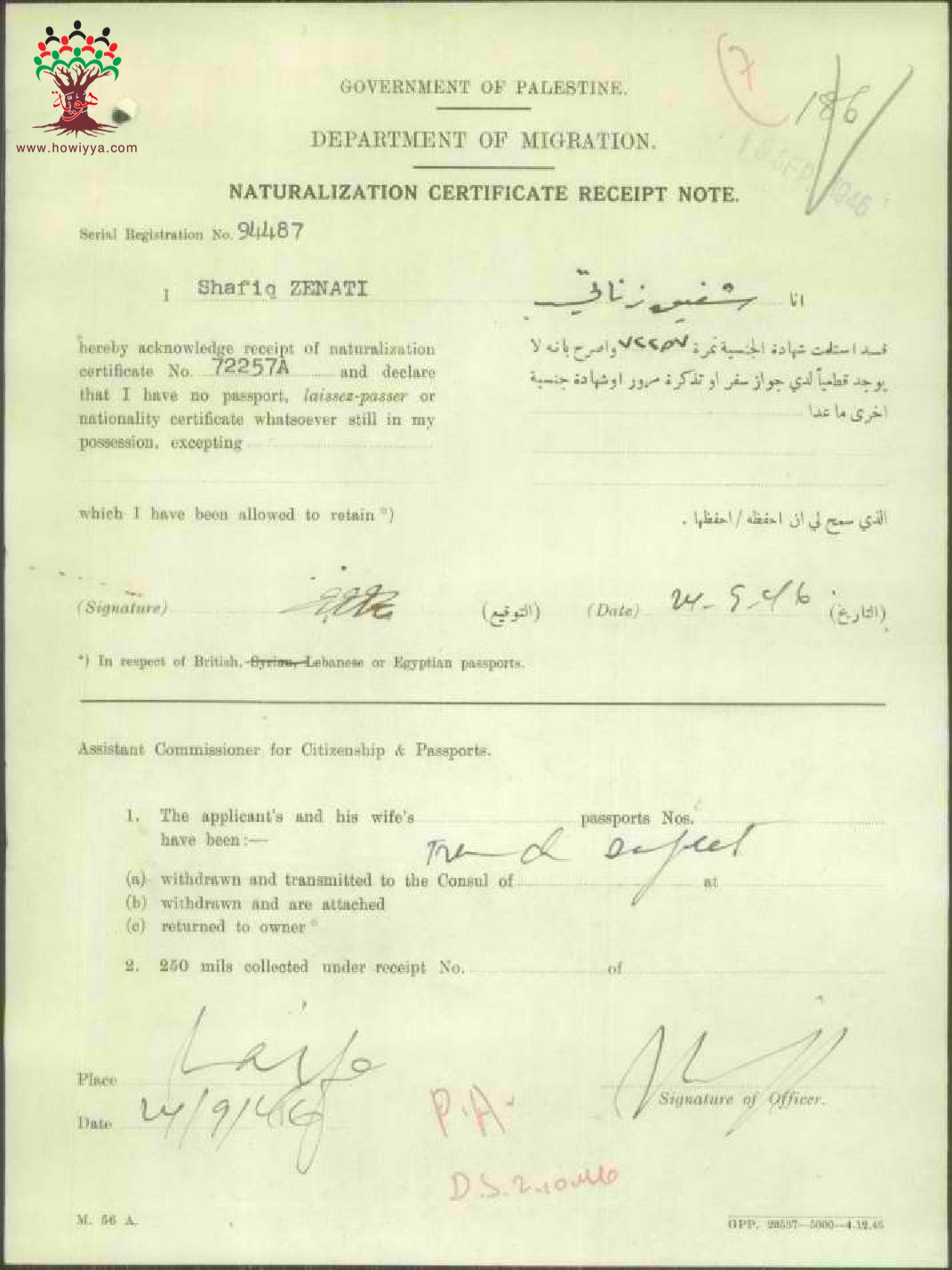ايصال موقع من شفيق زناتي باستلام شهادة الجنسية الفلسطينية
