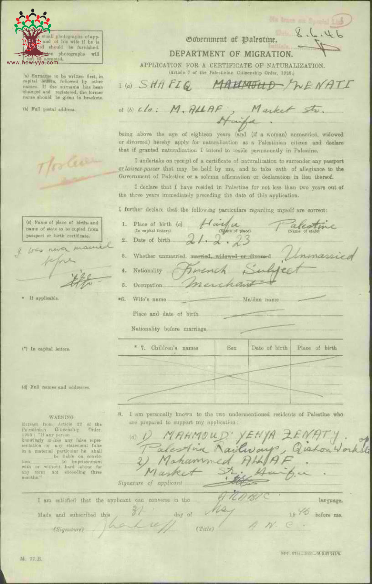 طلب الجنسية الفلسطينية - شفيق زناتي - حيفا