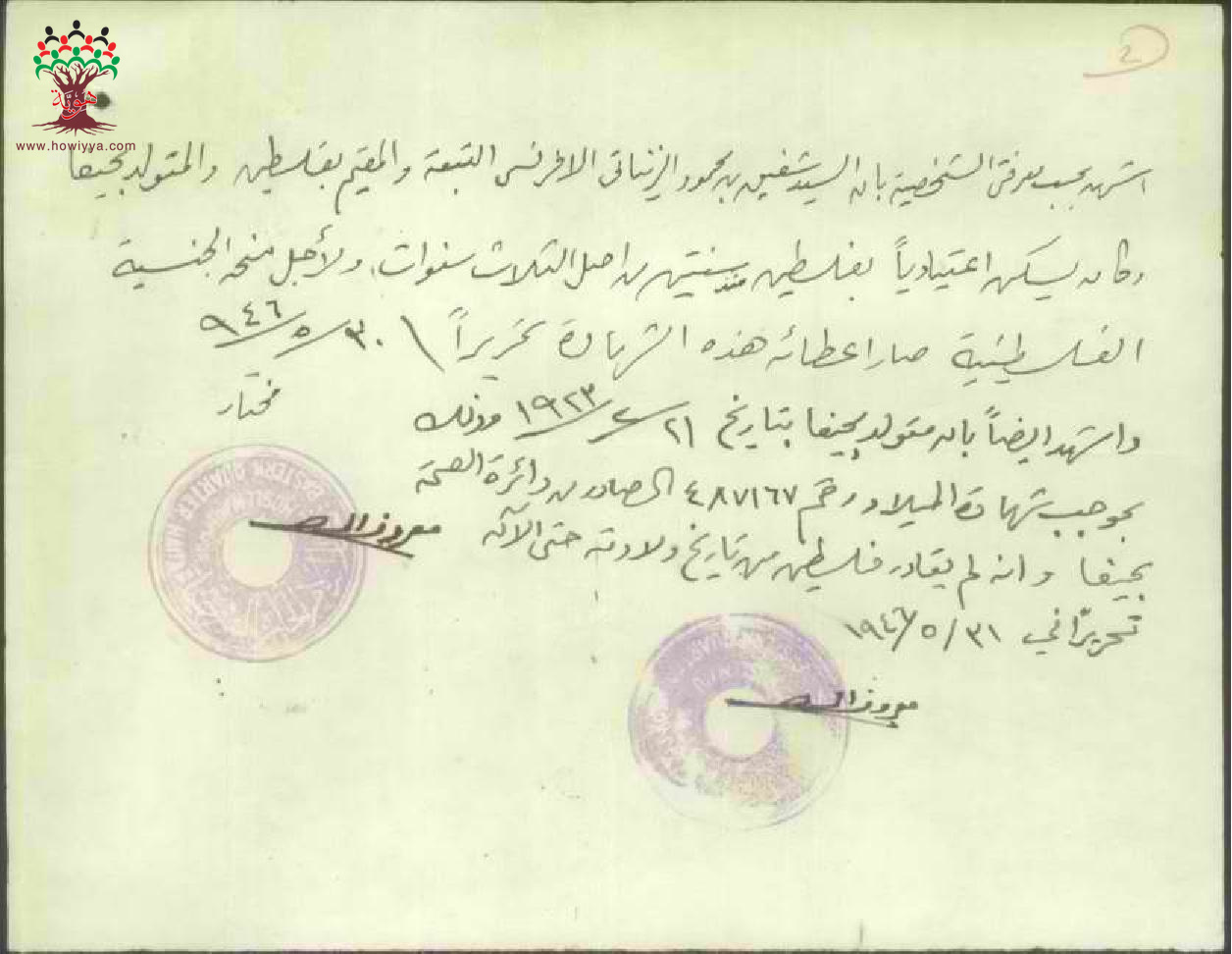 شهادة من المختار للسيد شفيق زناتي بخصوص طلب الجنسية الفلسطينية - حيفا