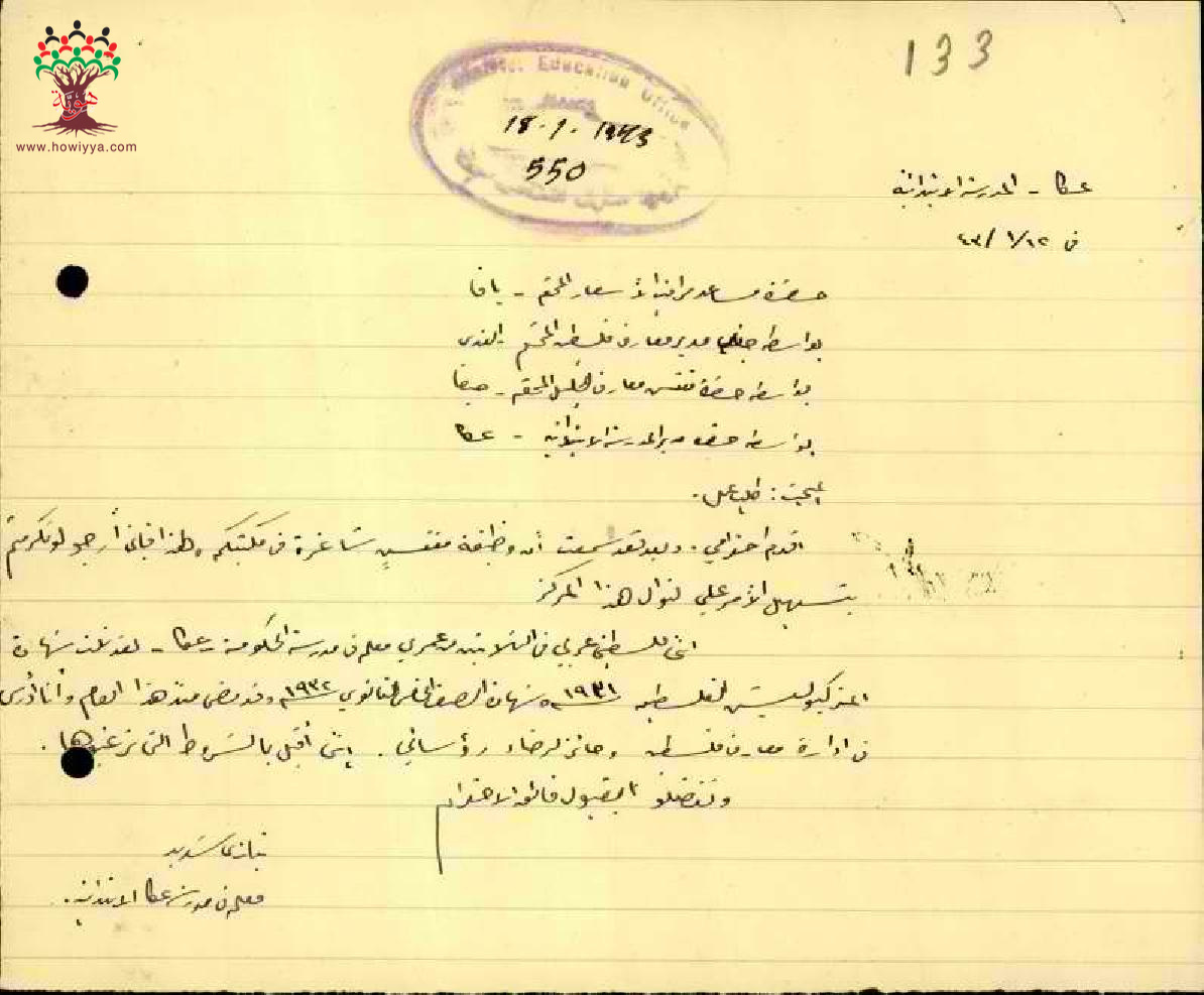 رسالة من المعلم نيازي شديد الى مفتش المعارف يطلب نقله الى مركز مفتش