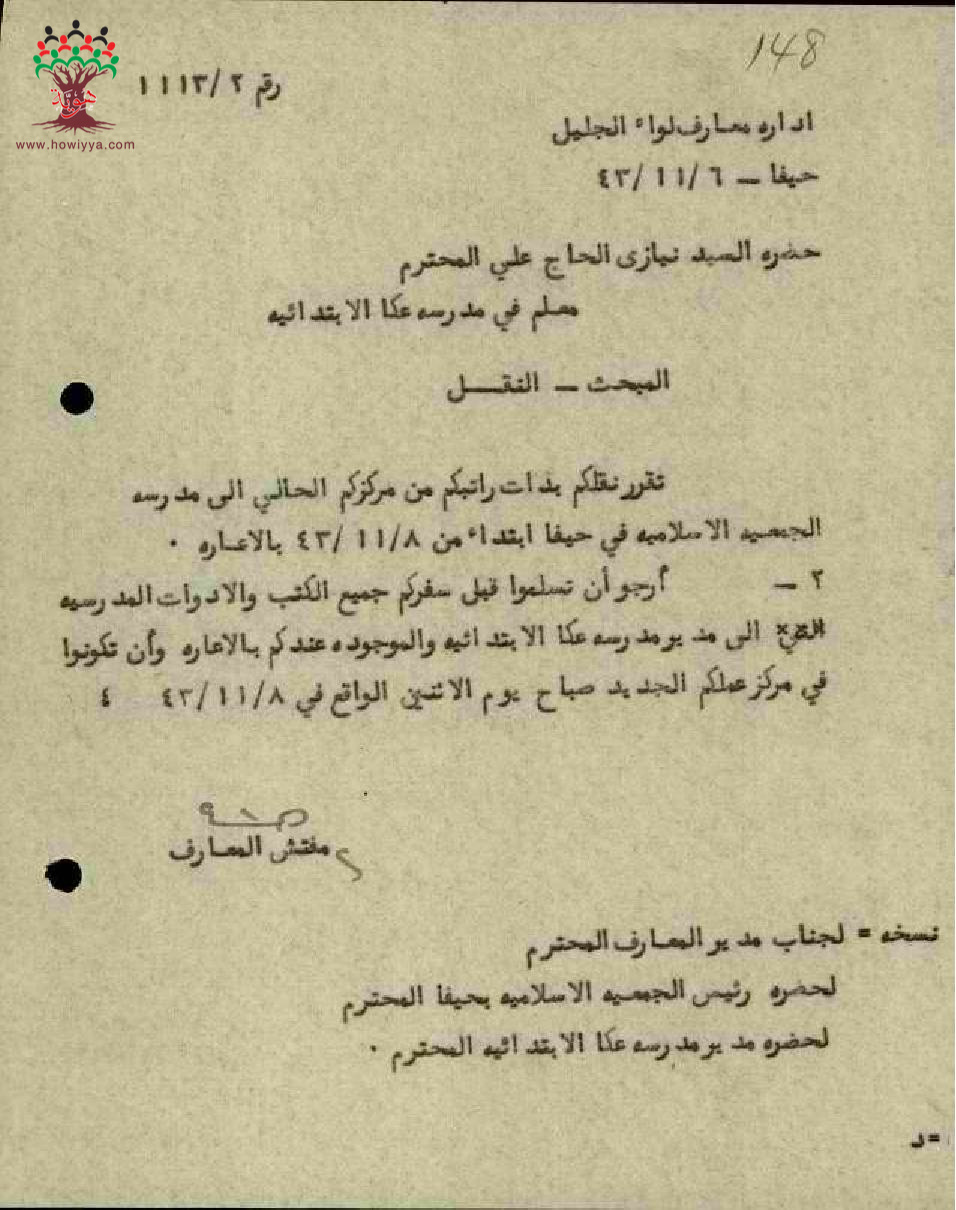 نقل المعلم نيازي شديد من مدرسة عكا الى مدرسة الجمعية الاسلامية في حيفا